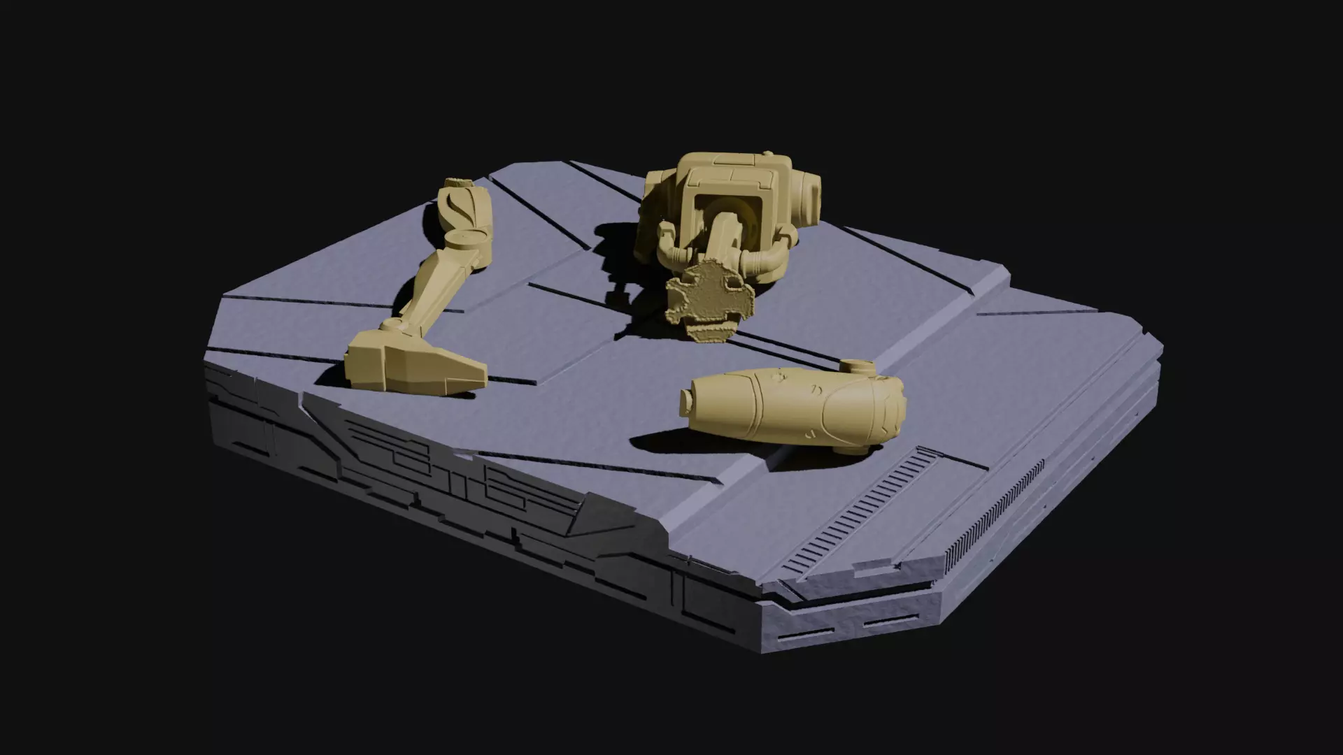 Este modelo 3D representa una base de diorama inspirada en el universo de Star Wars, mostrando los restos de un droide de batalla B1 caído en combate. Diseñada en escala 1/6, es perfecta para complementar figuras de colección como Hot Toys, Sideshow, o personalizadas del universo galáctico.