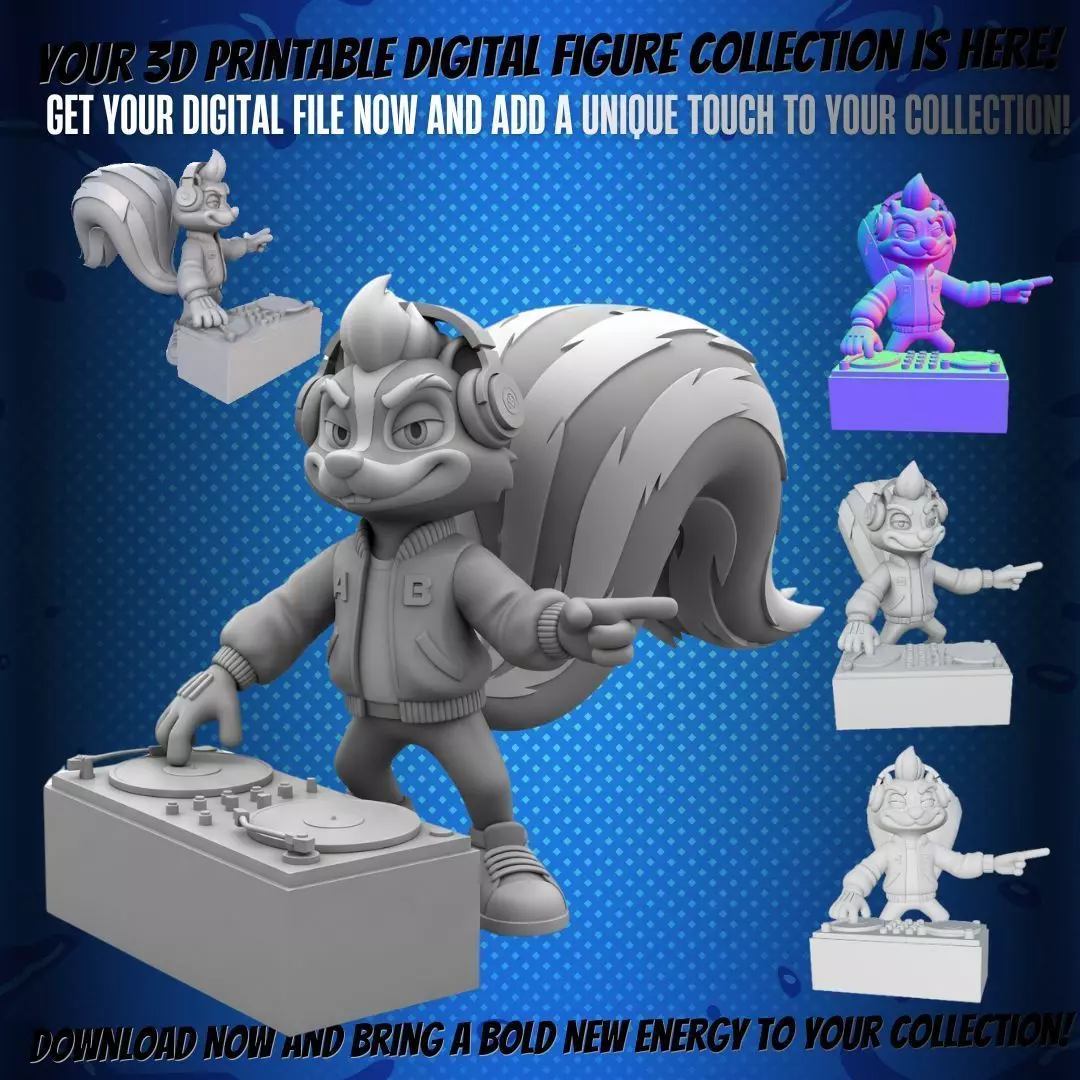 This stylized DJ skunk merges hip-hop culture with cartoon animal charm. Featuring headphones, a detailed turntable setup, lettered bomber jacket, and a classic striped tail, it's ready to rock your display shelf. Designed in monochrome gray tones, it’s ideal for post-print painting or LED integration.