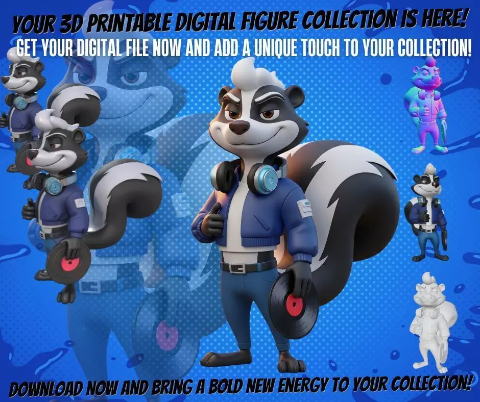This model represents a stylized skunk character inspired by modern street culture and the world of music. With its large tail, iconic black-and-white fur pattern, and dynamic pose, the figure reflects a full DJ vibe. The skunk wears a blue bomber jacket, white t-shirt, and denim pants with realistic fabric folds. Around its neck hangs a pair of headphones, and in its right hand, it holds a vinyl record. The left hand shows a thumbs-up gesture, giving the figure a cool and confident presence. The simple white base provides stability and clean display aesthetics. Designed for high-resolution 3D printing, the model retains all its fine details and is suitable for post-painting or multicolor 3D printing.