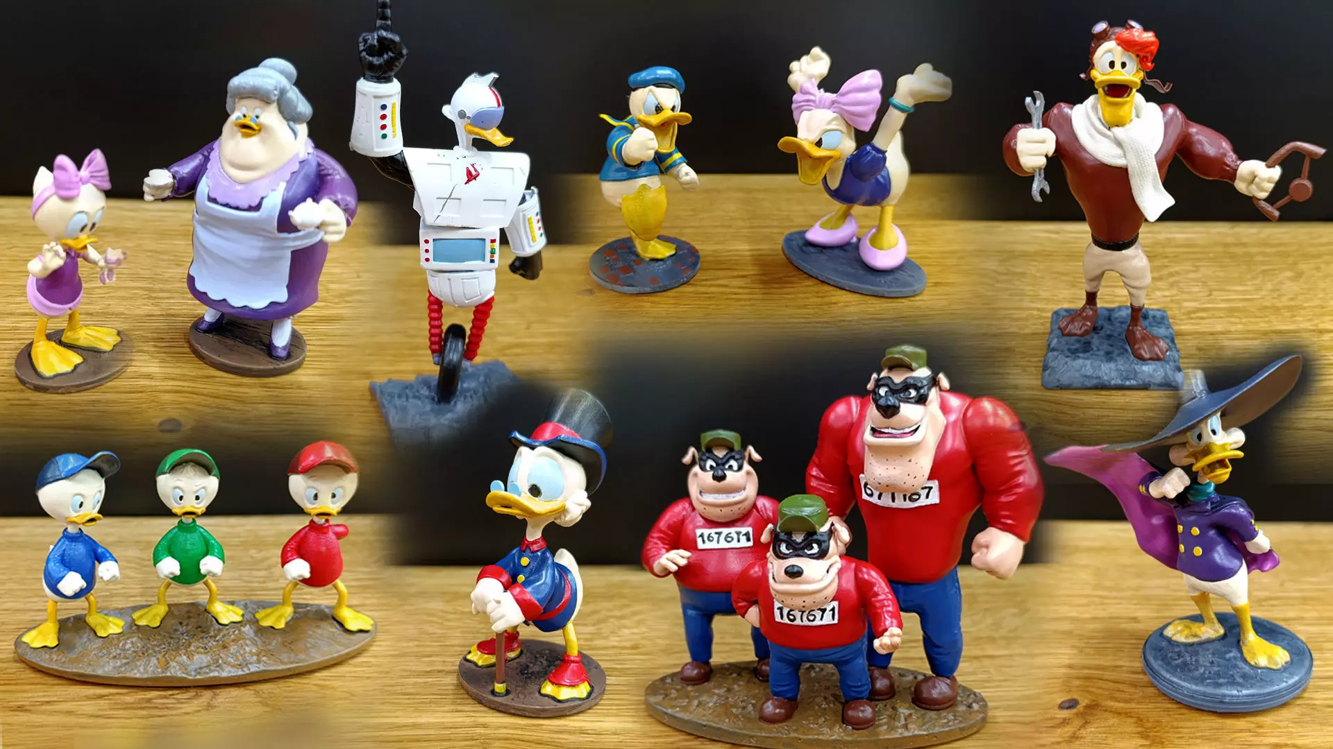 Characters: Scrooge McDuck, Donald, Darkwing duck, Launchpad McQuack, Daisy, Webby Vanderquack, Mrs. Bentina Beakley, Huey, Dewey, and Louie, BeagleBoys(3 characters), Gizmoduck.