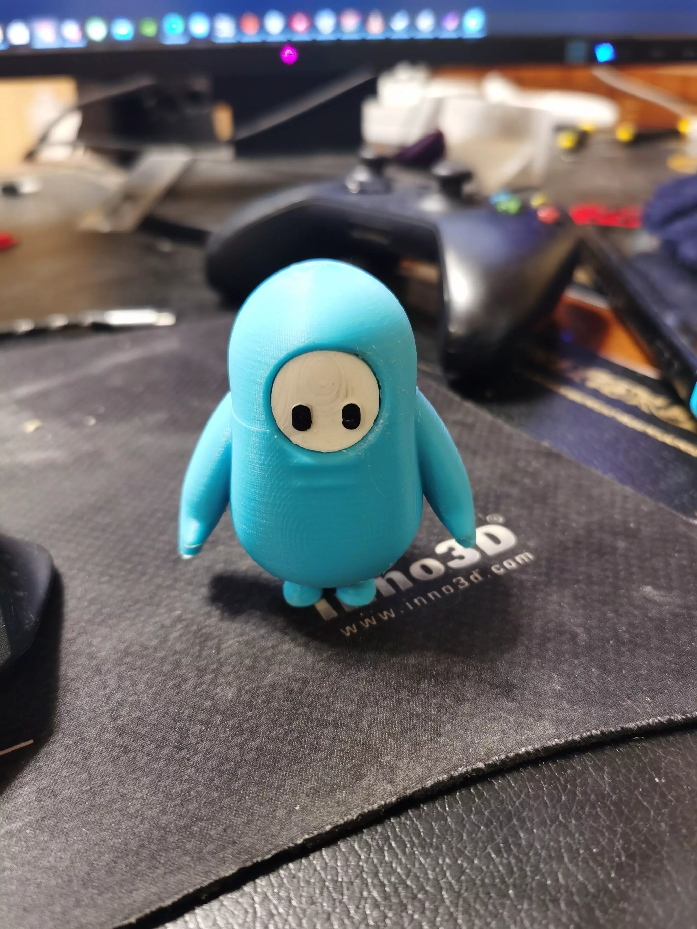 3 piece model of the default character from Fall Guys. Designd by MyOnline3DPrinter for 3D printing purposes. Pieces are designed separately to allow for printing in different colors, such as printing the body in a specific color but leaving the face white. Eyes on the face can be easily colored in with a black sharpie marker. after all peices are glued, assembly is simple with a bit of glue to hold everything together. Images include a couple of blender models as well as some 3D Printed characters that are all assembled and glued. In the blender models, i was unable to get texture painting to work so the eyes reamin the same color as the face.
