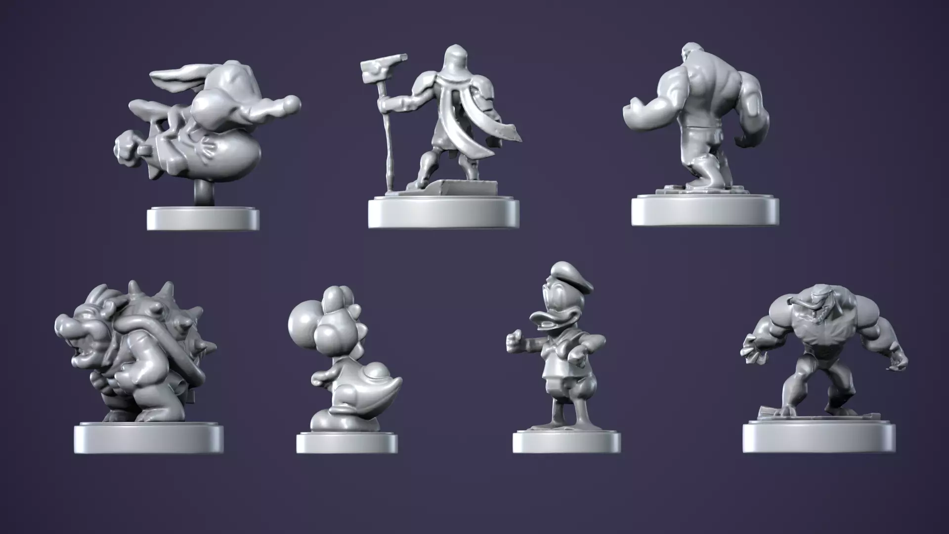 Hulk: Capture the essence of the Hulk's immense strength and iconic appearance.Venom: Unleash the fearsome look and intricate details of Venom.Bowser: Bring the imposing presence of Bowser to life.Donald Duck: Add the charming personality of Donald Duck to your collection.Wile E. Coyote: Capture the whimsical spirit of the classic Looney Tunes character.Yoshi: Highlight the cheerful personality and details of Yoshi.Mystery Character: Discover the charm of this unique and detailed figure, perfect for adding a touch of mystery to your collection.Each figure is available in STL, GLB, OBJ, FBX, and PLY formats, ensuring compatibility with a variety of 3D printers and software. This collection is perfect for enthusiasts, collectors, and fans of these beloved characters. Print, display, and enjoy the craftsmanship of these figures in your home, office, or studio.
