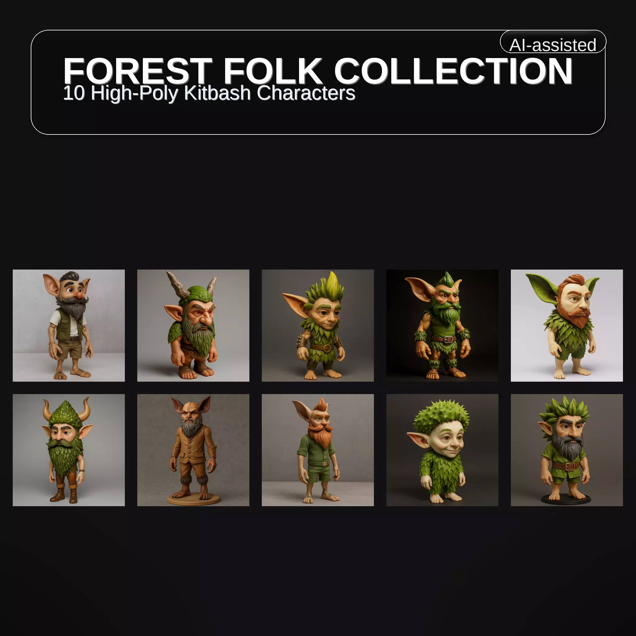 3D Design ConceptMeet the Forest Folk—a charming crew of woodland characters with big ears, expressive faces, and handcrafted outfit details. Each character blends nature-inspired elements (leafy hair, mossy beards, forest textures) with adventurer styling (belts, vests, boots), creating a playful fantasy vibe that works for miniatures, dioramas, and game projects.