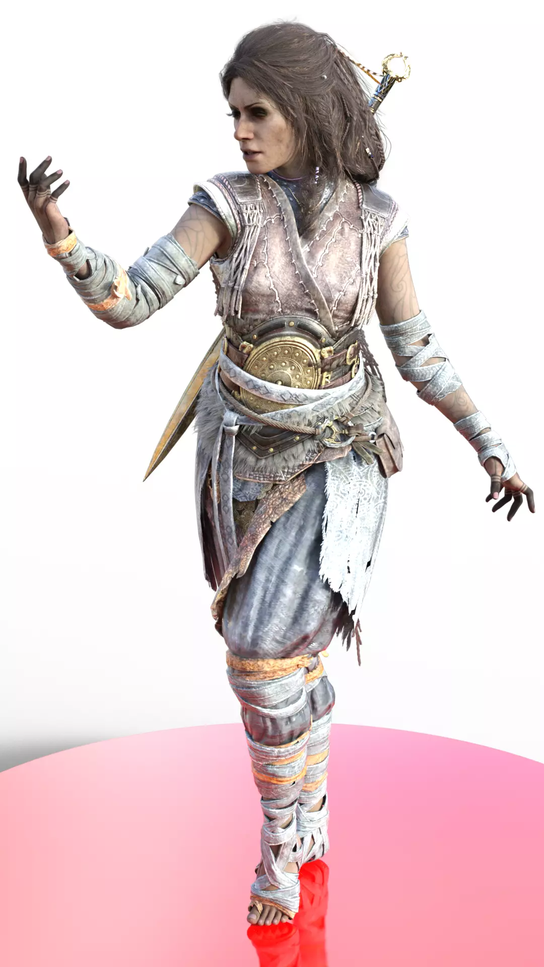 A highly detailed, photorealistic 3D render of the character Freya from the God of War series, specifically depicting her warrior/witch aesthetic. The model features a fierce expression and a pose suggesting magical readiness, with one hand slightly raised. Her hair is a mix of braids and loose strands, with a sword (likely the golden sword of the Valkyries) hilt visible behind her.