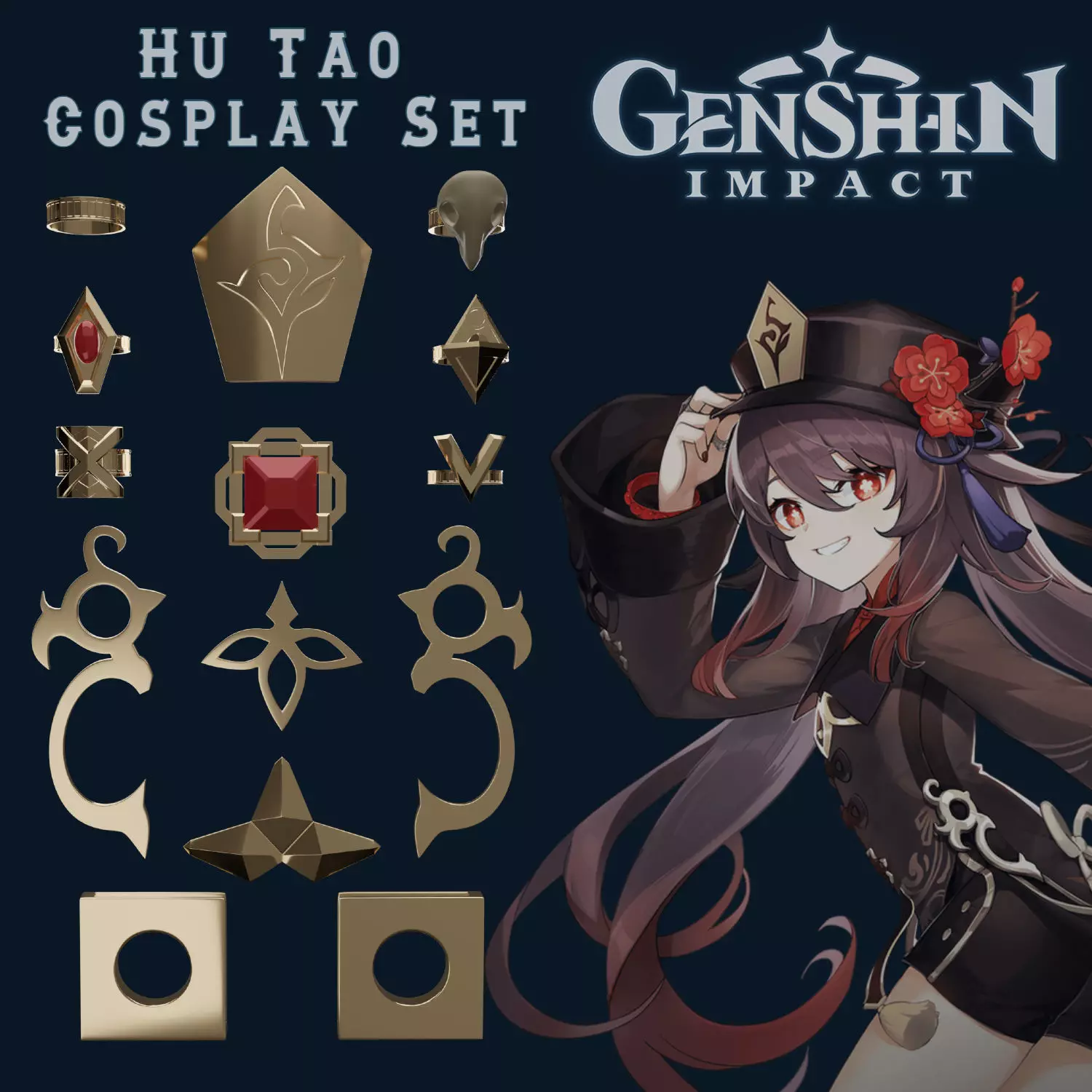 Hard surface high detailed accessories Genshin Impact Hu Tao set designed for 3D printing. Contains 12 items devided on 19 STL files with pins and holes for comfortble FDM or SLA printing. Contains flat items ready to print on table.