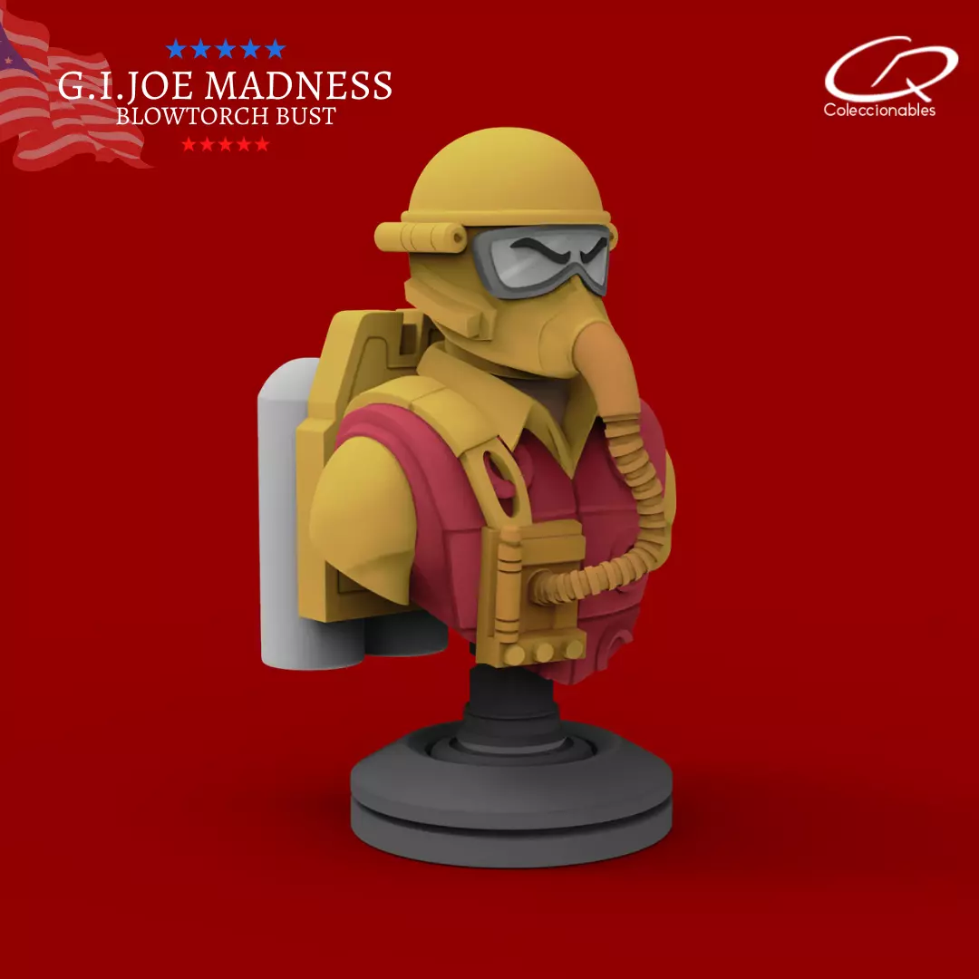 Blowtorch inspired by the G.I JOE characters. This product comes with all the STL files ready for 3d printing. This bust has an approximate height of 3.9 inches. Its size is ideal for print in a standard 3d print machine and has the perfect size to collect them. Each character can be printed in the technology of your choice - PLA or Resin - and then you can paint them with the visual reference that we share with the download files.