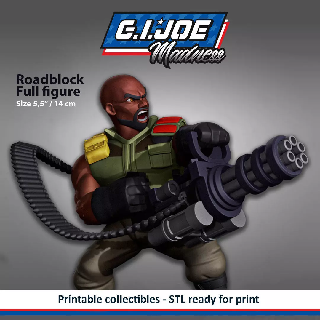 Roadblock is inspired by the G.I JOE characters. This collectible toy comes with all the STL files ready for 3d printing. This figure has an approximate height of 5.5 inches. Its size is ideal for print in a standard 3d print machine and has the perfect size to collect them. (think about in Funkos, the size is just the right one!). Each character can be printed in the technology of your choice - PLA or Resin - and then you can paint them with the visual reference we share with the download files.