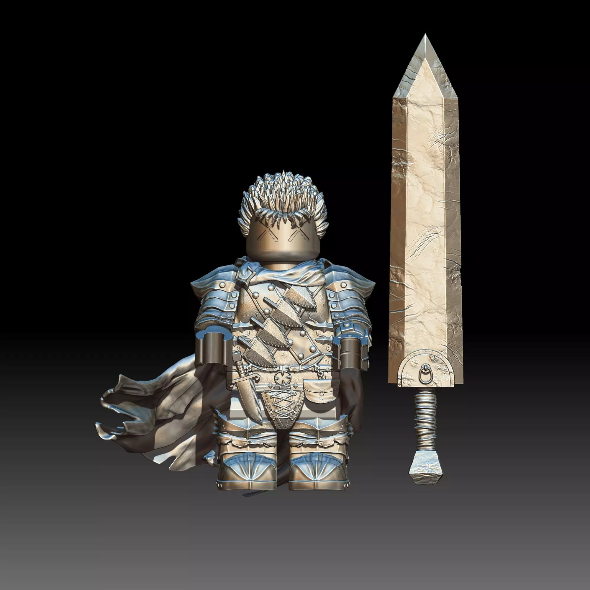 This custom minifigure is inspired by Guts from Berserk, known for his heavy armor, stoic presence, and the iconic Dragon Slayer greatsword. Every detail—from armor plates, straps, torn cape, to the rough metal textures—is carefully crafted to capture the signature dark fantasy style of Berserk.