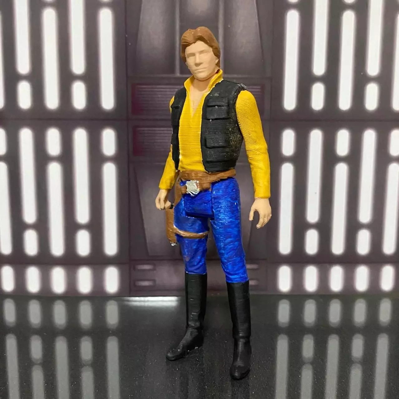 3D model descriptionA 3D model character inspired by Han Solo from Star Wars, in the style of vintage Kenner toys.