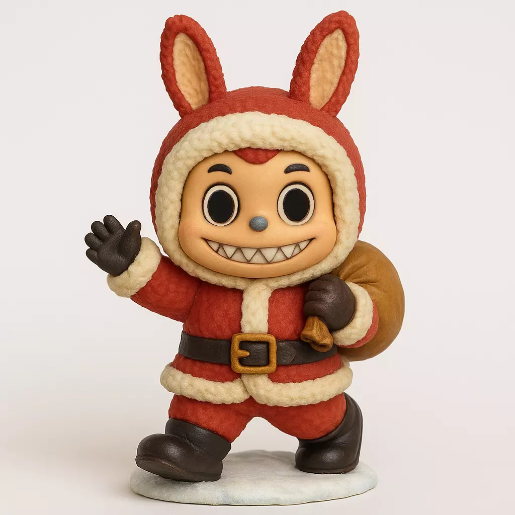 A stylized winter-themed Labubu figure with the character’s signature wide smile and large ears. Rounded volumes, soft contours and an energetic pose create a lively and friendly silhouette.Well-suited for collections, holiday displays and thematic dioramas.
