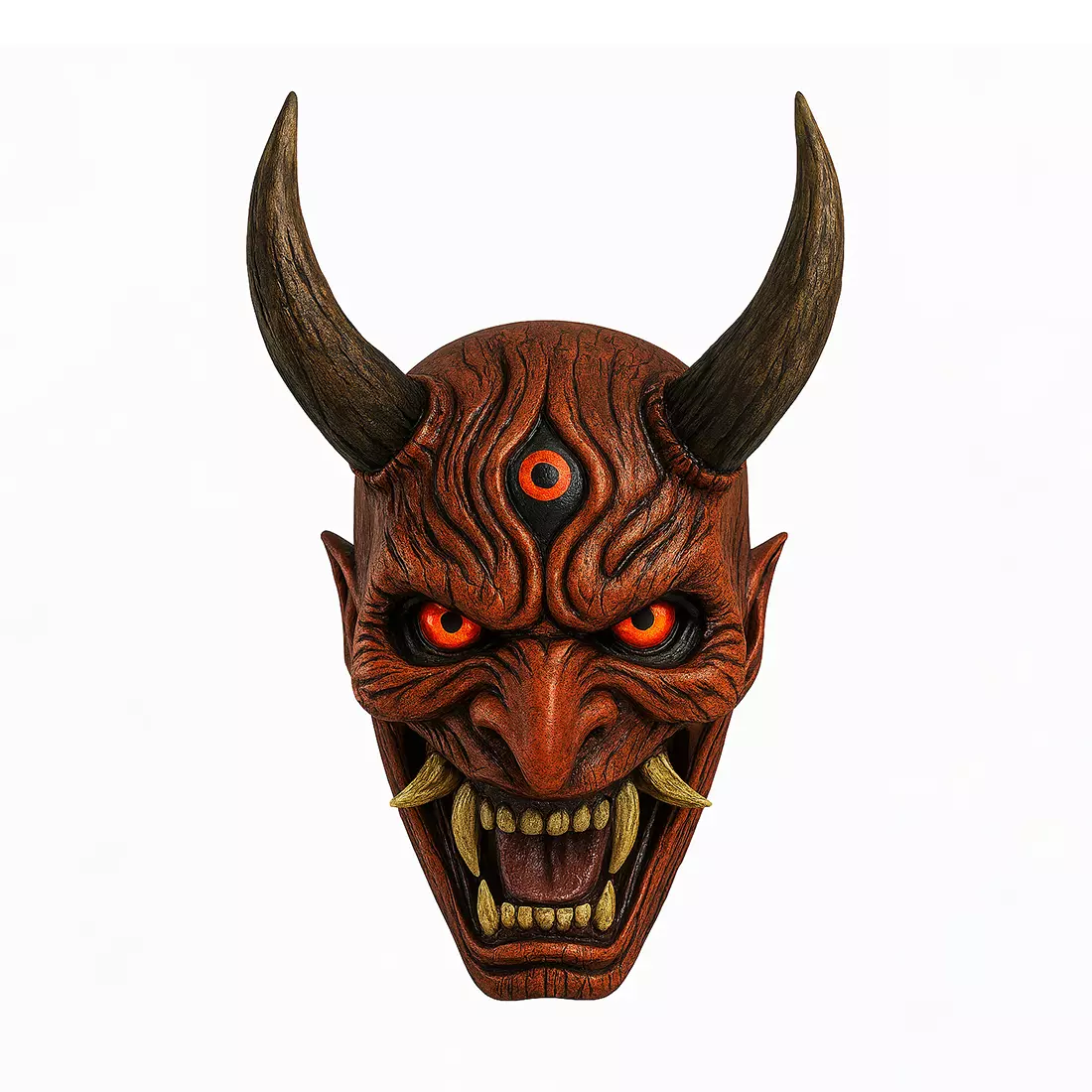 hannya mask specifically symbolizes intense emotions like rage and jealousy, with typical features including two sharp horns, wide metallic eyes, and a leering mouth with long, sharp teeth. The red color signifies a full transformation into a true demon, fueled by uncontrollable jealousy and rage. This mask is closely associated with Noh theater and Buddhist themes of human suffering and emotion, portraying a woman consumed by unrequited love and vengeance.
