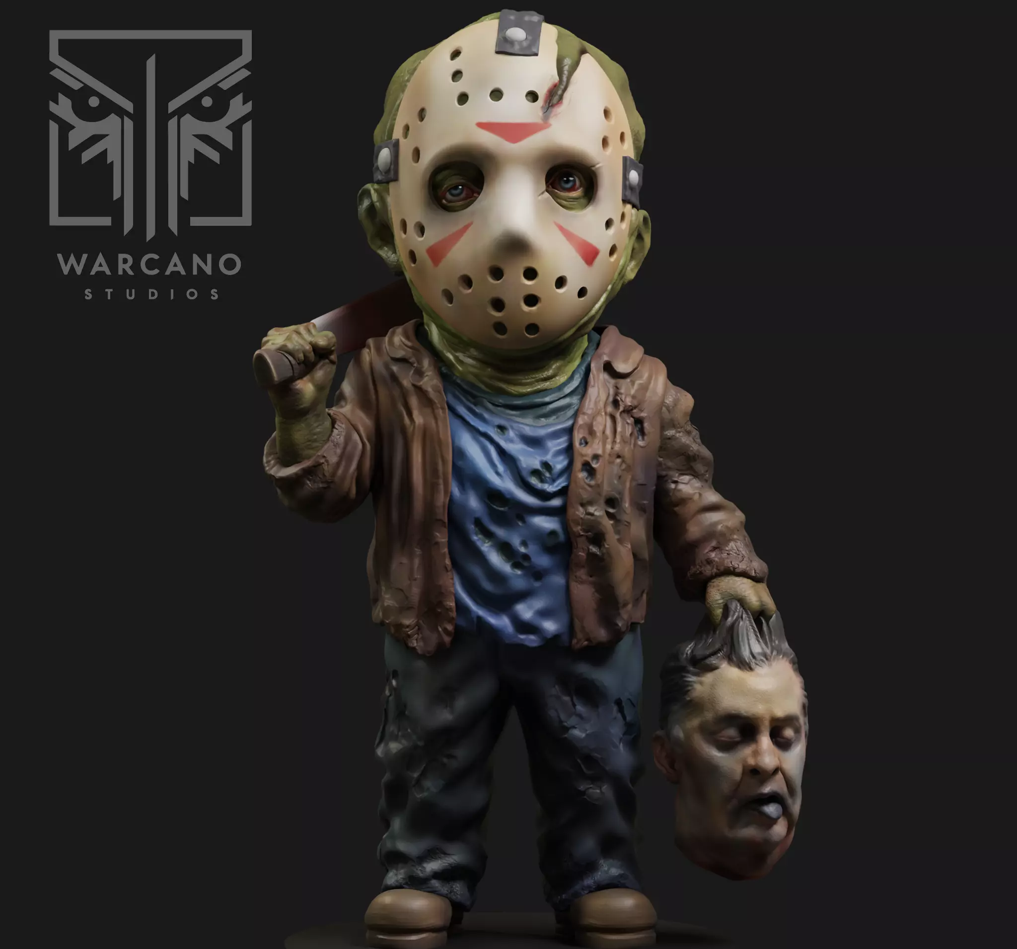 12 cm tall STL sculpture of Jason Voorhees. The sculpture depicts Jason holding a decapitated enemy's head in one hand and his iconic machete in the other. The character is portrayed with exaggerated and expressive features, offering a unique twist on the classic horror figure