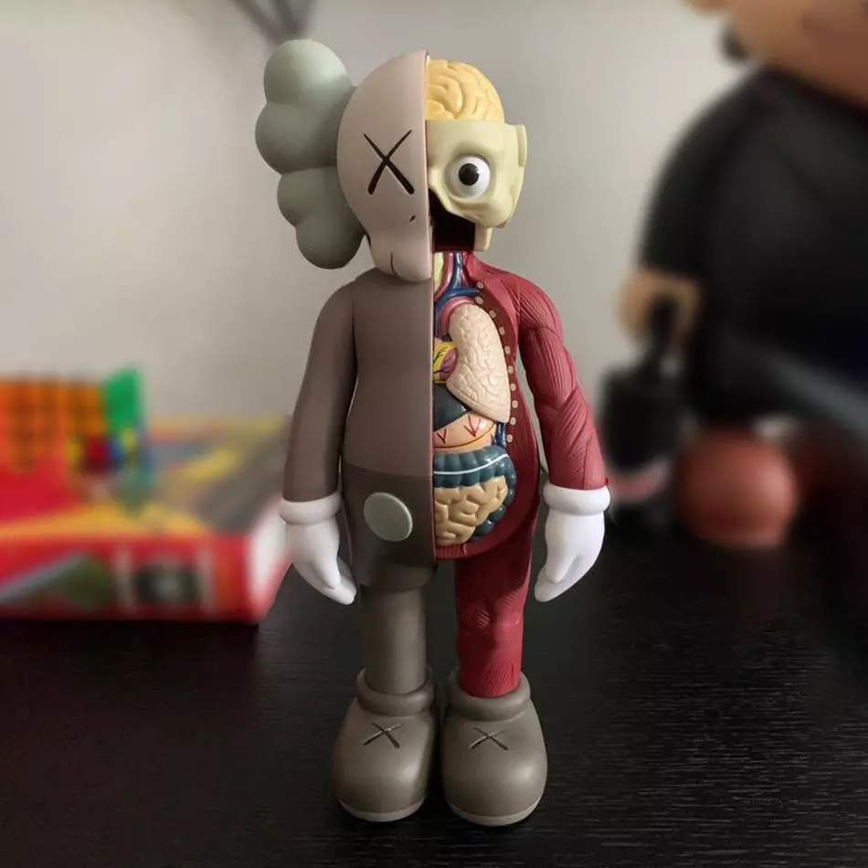 This is a 3D printing model so it has no texture and only comes in one solid piece.If you are looking for this piece with textures and cutting service, you can get it here:https://www.cgtrader.com/3d-models/architectural/decoration/kaws-flayed-open-companion-textured