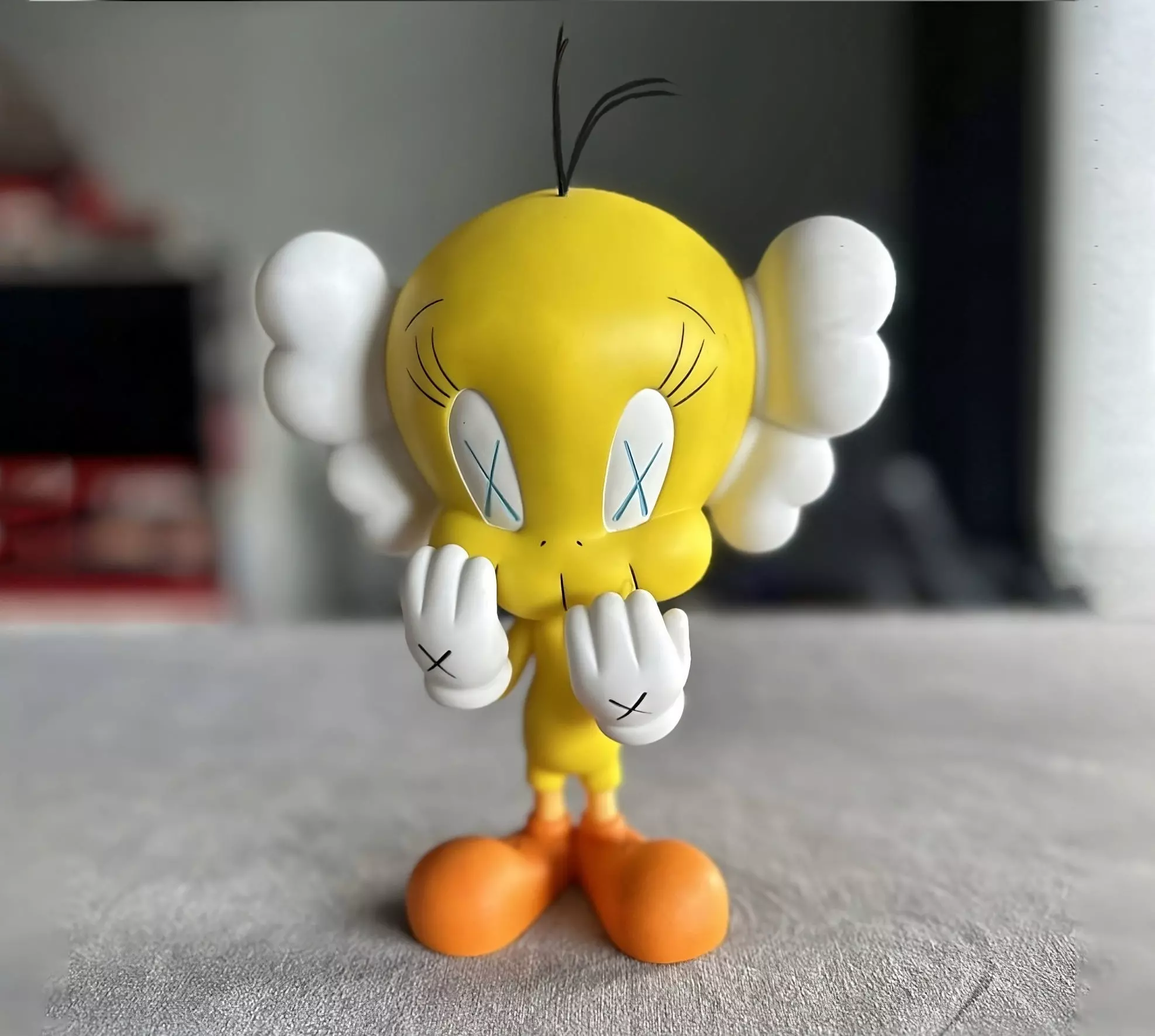 This is a 3D printing model so it has no texture and only comes in one solid piece.If you are looking for this piece with textures and cutting service, you can get it here:https://www.cgtrader.com/3d-models/interior/living-room/kaws-tweety-textured