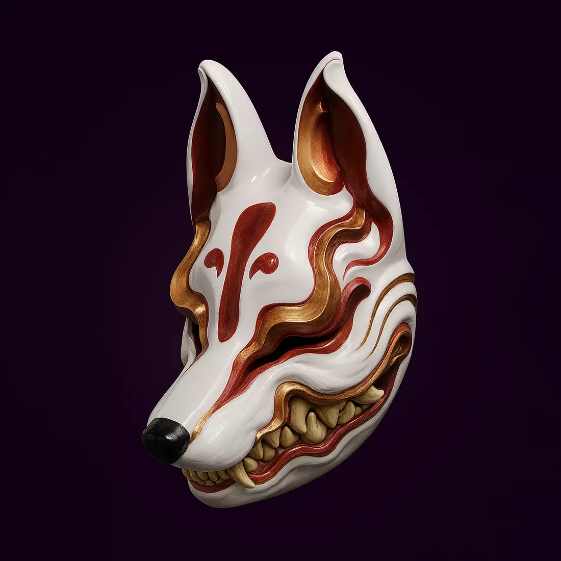 Kitsune Mask Kurayami is a stylized Japanese mask representing the fox spirit with a dark aesthetic, symbolizing the mystical and ambivalent powers of the Kitsune in Japanese culture, often worn for spiritual, ritualistic, artistic, or festive reasons.