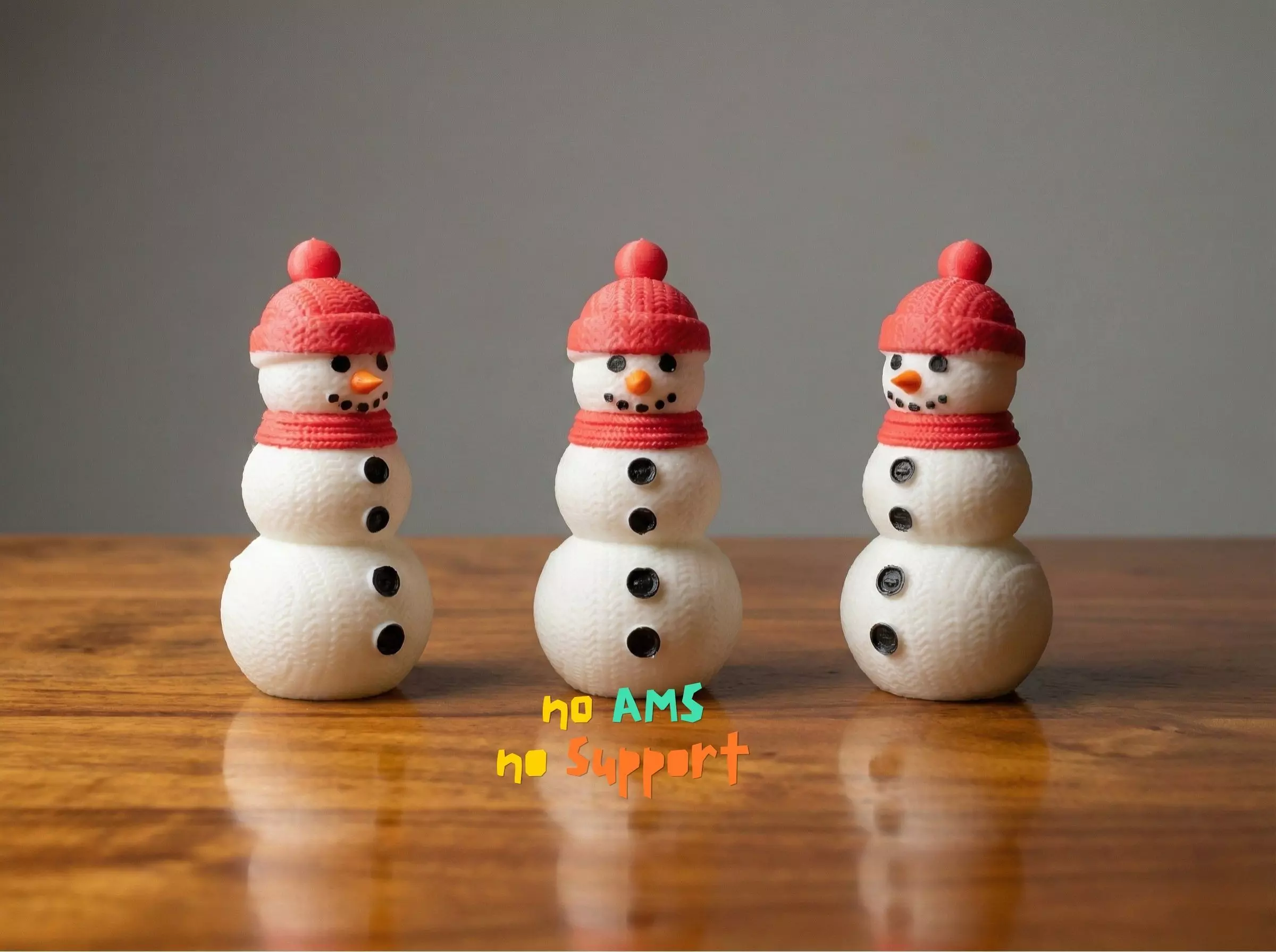 no AMS needed, just change the filament color at the desired level, if needed help drop me a message here and i will help you with thatalso 3 models included the thick body knitted, the normal knitted body and the charismas hat detailed top (requires a 00.08 mm layer heightgenerally, no support needed as the printed picture happy printing