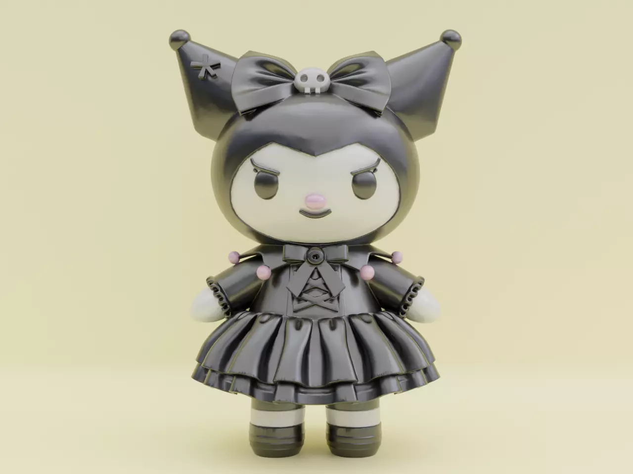 Bring a touch of kawaii-punk style to your 3D printer with this model of the beloved Sanrio character, Kuromi, in her iconic gothic lolita dress. This charming figurine is designed as a single, solid piece, optimized for a straightforward and enjoyable FDM or Resin printing experience. It's ideal for creating a delightful desk ornament, a unique collectible figure to paint, or a fantastic gift for any Sanrio fan.Perfect for Kuromi enthusiasts, 3D printing hobbyists, and collectors of cute-but-edgy characters, this model captures Kuromi in a classic standing pose. It features all her signature details, from the jester's hat with its skull bow to the layered, ruffled skirt and lace-up bodice. Add this mischievous yet stylish character to your collection or let her bring a unique flair to your display shelf. Ready for your printer to bring Kuromi to life!