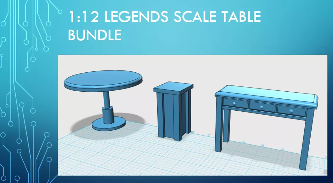 1:12 Legends scale table bundle STL 3d Files for 3d Printing. Perfect for mansions, doll houses, and dioramas.
