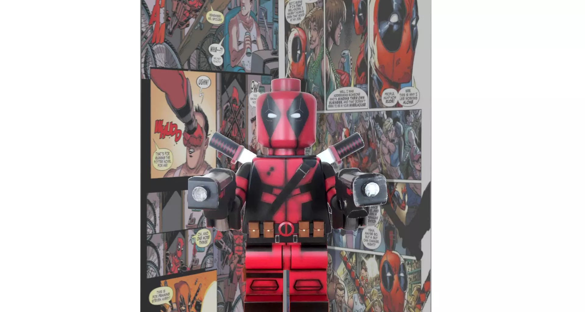Based on the design of the Lego mini figure, this 74 cm tall Deadpool brings together the best of both worlds (Lego and Marvel). Head, arms, hands and legs move as expected.It is accompanied by its accessories with pistols, swords, saddlebags and many small details that make it unique and customizable at will. The set is accompanied by assembly instructions, a model for the templates and the RAL color codes used.