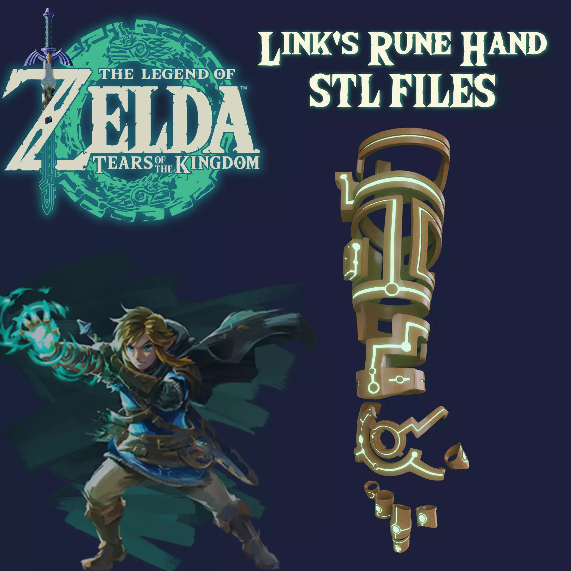 Printable Link Runed arm with finger rings from Legends of Zelda Tears of The Kingdom. Designed for 186cm man. Assembly on pins and magnets. Many separation options for ease of printing as much as possible. You can scale each part separately for your hand.