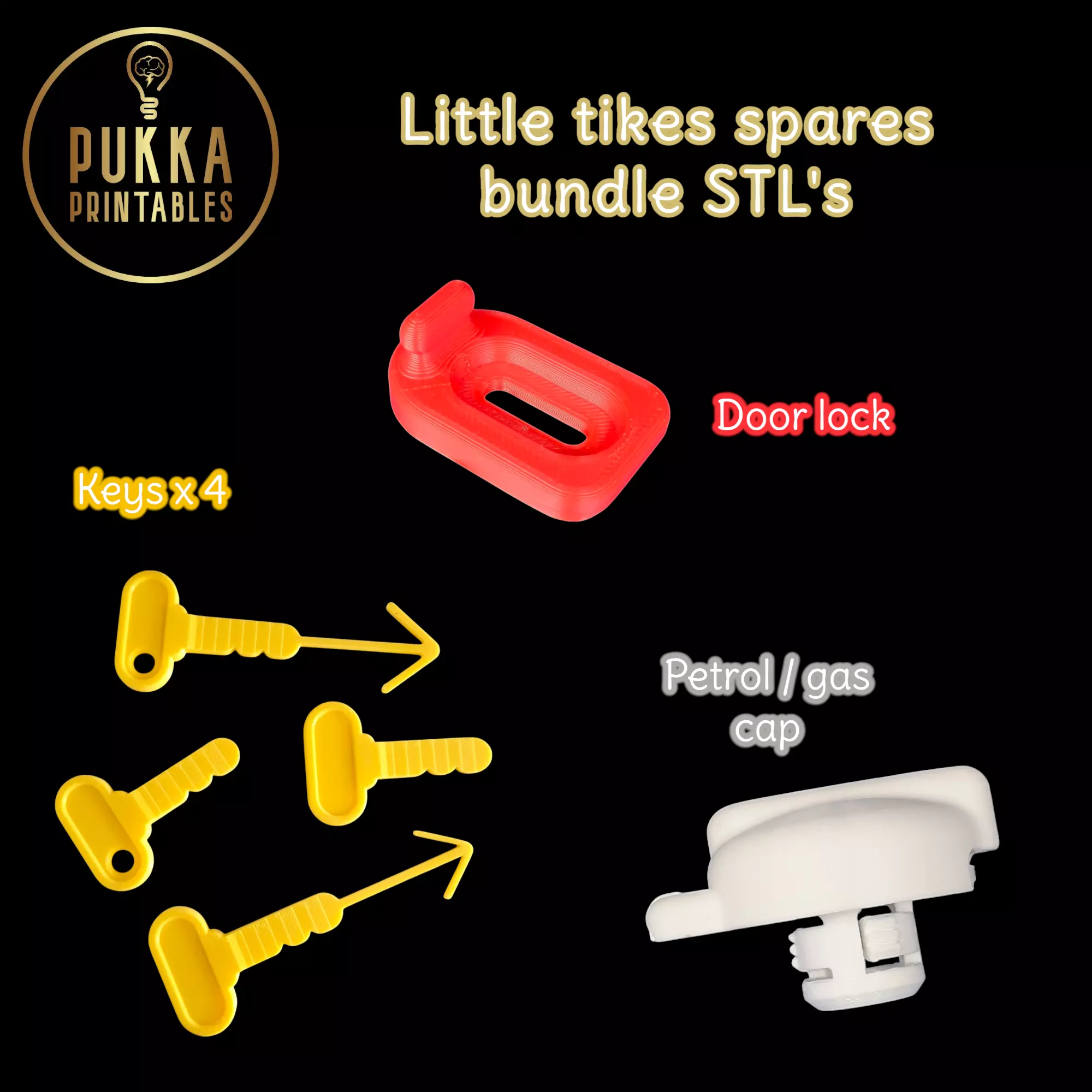 This 3D printable replacement parts bundle is designed for Little Tikes ride-on toy cars and includes a petrol/gas cap assembly, replacement door lock, and multiple key variations. These parts provide a practical solution for repairing or restoring ride-on vehicles where original components are missing or damaged.