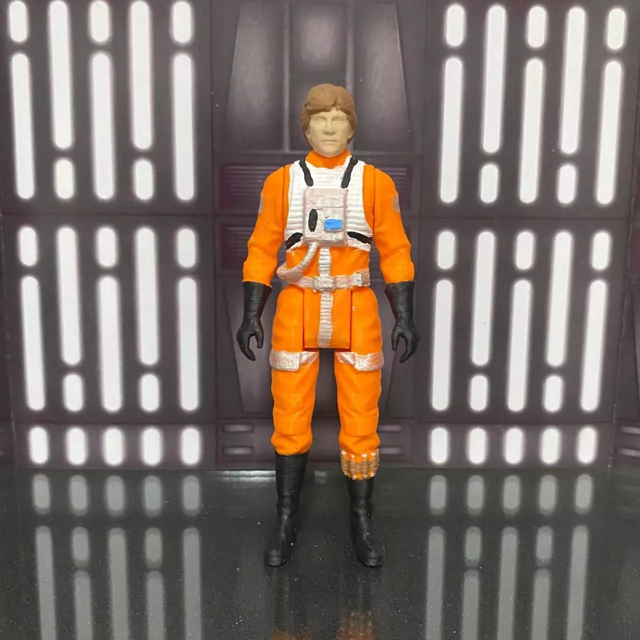 A 3D model character inspired by Luke Skywalker Alliance Rebel Pilot from Star Wars, in the style of vintage Kenner toys.