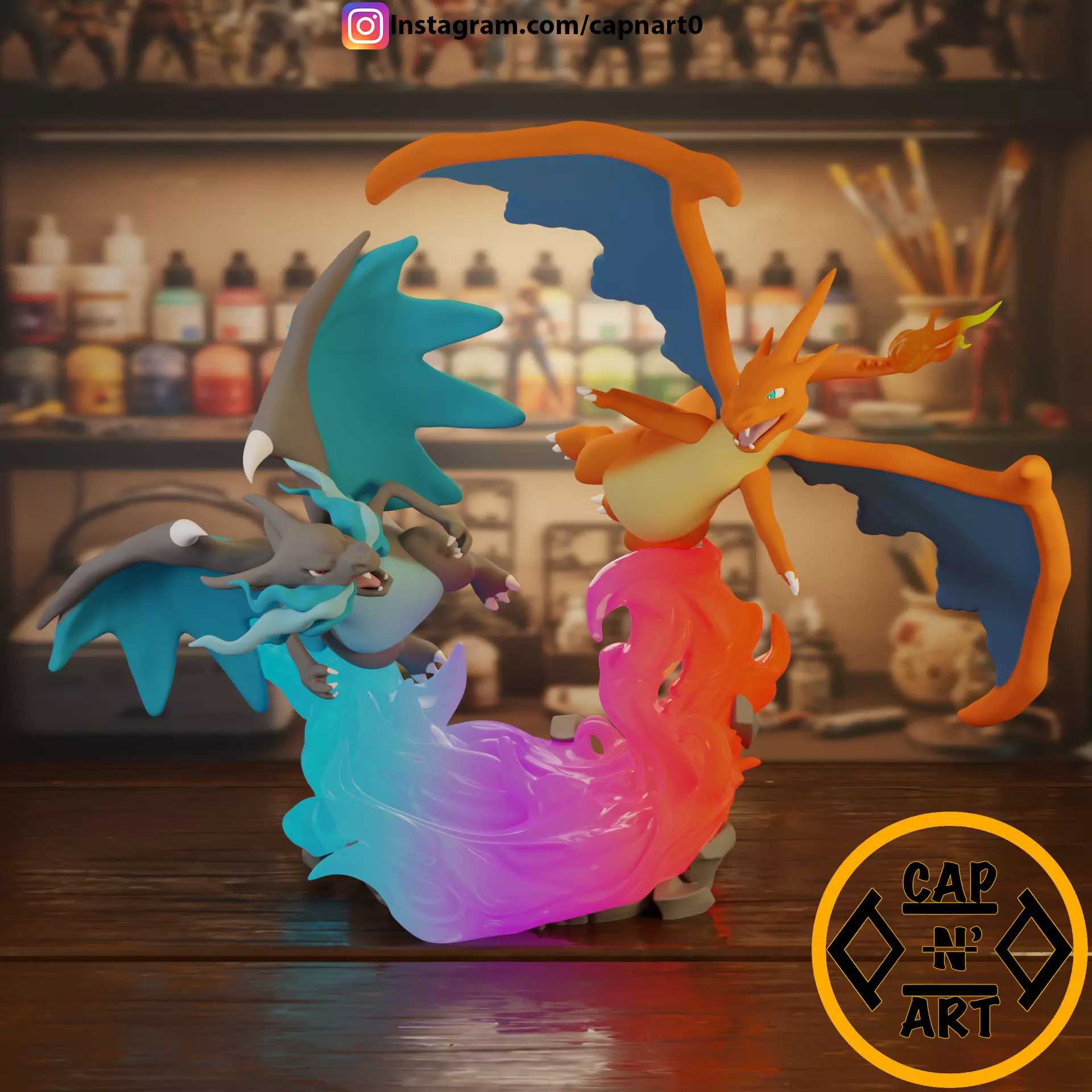 This model captures the iconic clash between Mega Charizard X and Mega Charizard Y, united by a dynamic swirl of opposing flames — cool blue energy rising against intense orange fire.Designed for decorative use, this piece makes a bold centerpiece for any Pokémon fan or collector.