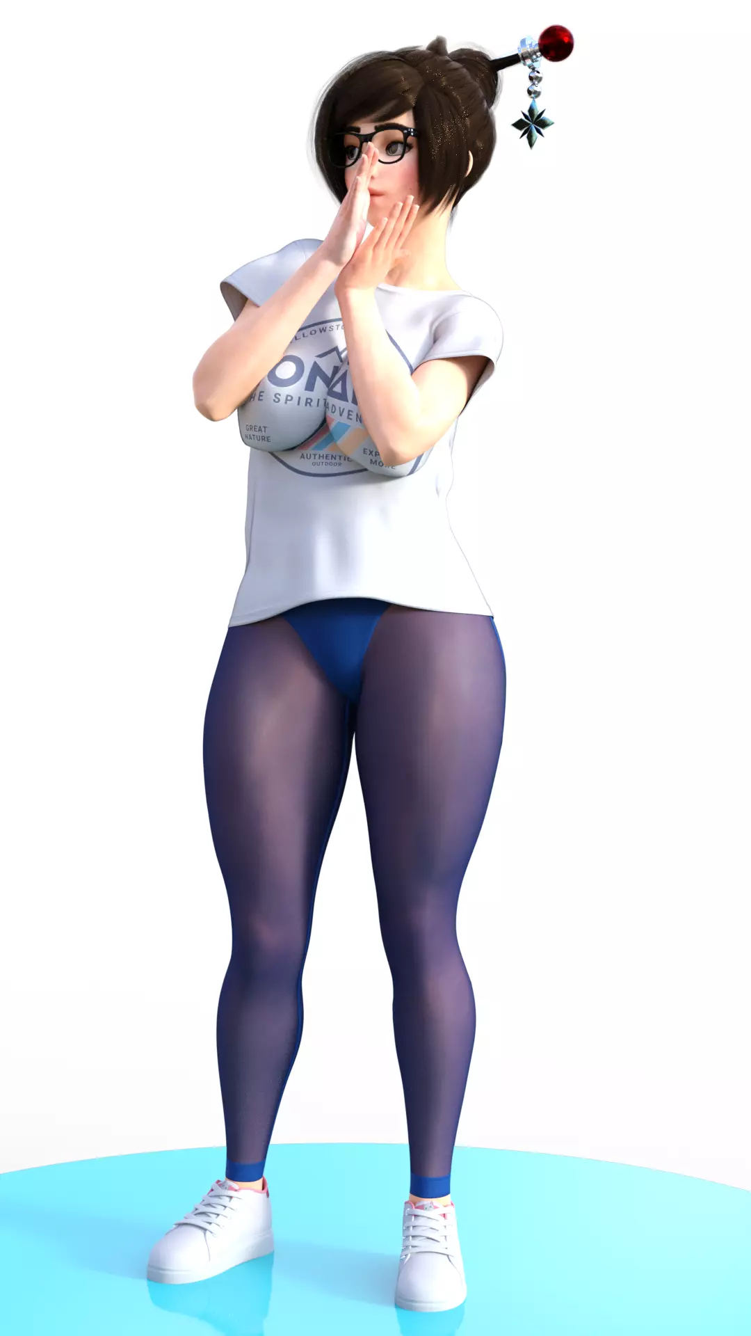 A high-quality 3D render showing Mei from Overwatch in a casual, summer-appropriate outfit. Unlike her bulky winter suit, she is wearing a white short-sleeve T-shirt with a mountain graphic (possibly Yellowstone or a national park), dark blue tights (or pantyhose), and white sneakers.