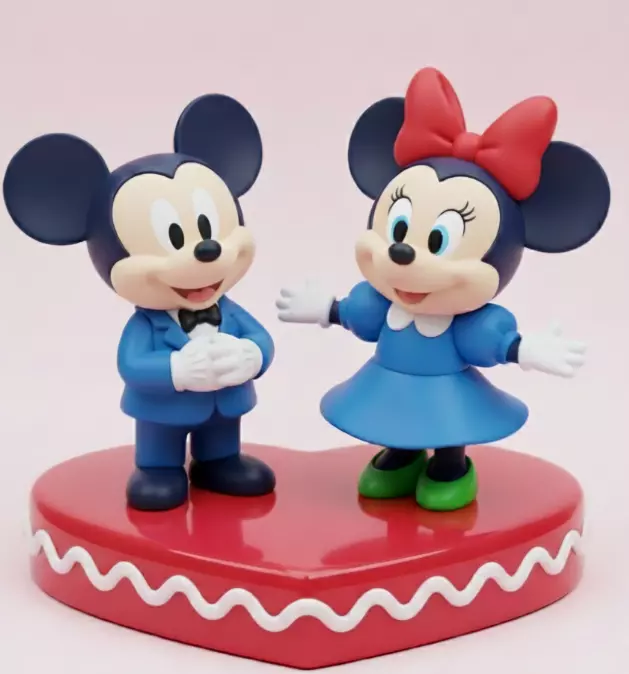 Capture the magic of love with this high-quality, Disney-inspired 3D model featuring a charming mouse couple. The male mouse is dressed in a sharp blue tuxedo with a black bowtie, while the female mouse charms in a matching blue dress with a signature red bow. They stand gracefully upon a stylized red heart-shaped base decorated with white icing-style waves. This model is optimized for high-detail printing, making it the perfect centerpiece for wedding cakes, anniversary celebrations, or as a collectible shelf figurine. The characters feature expressive faces and smooth, rounded geometry designed for easy sanding and painting.