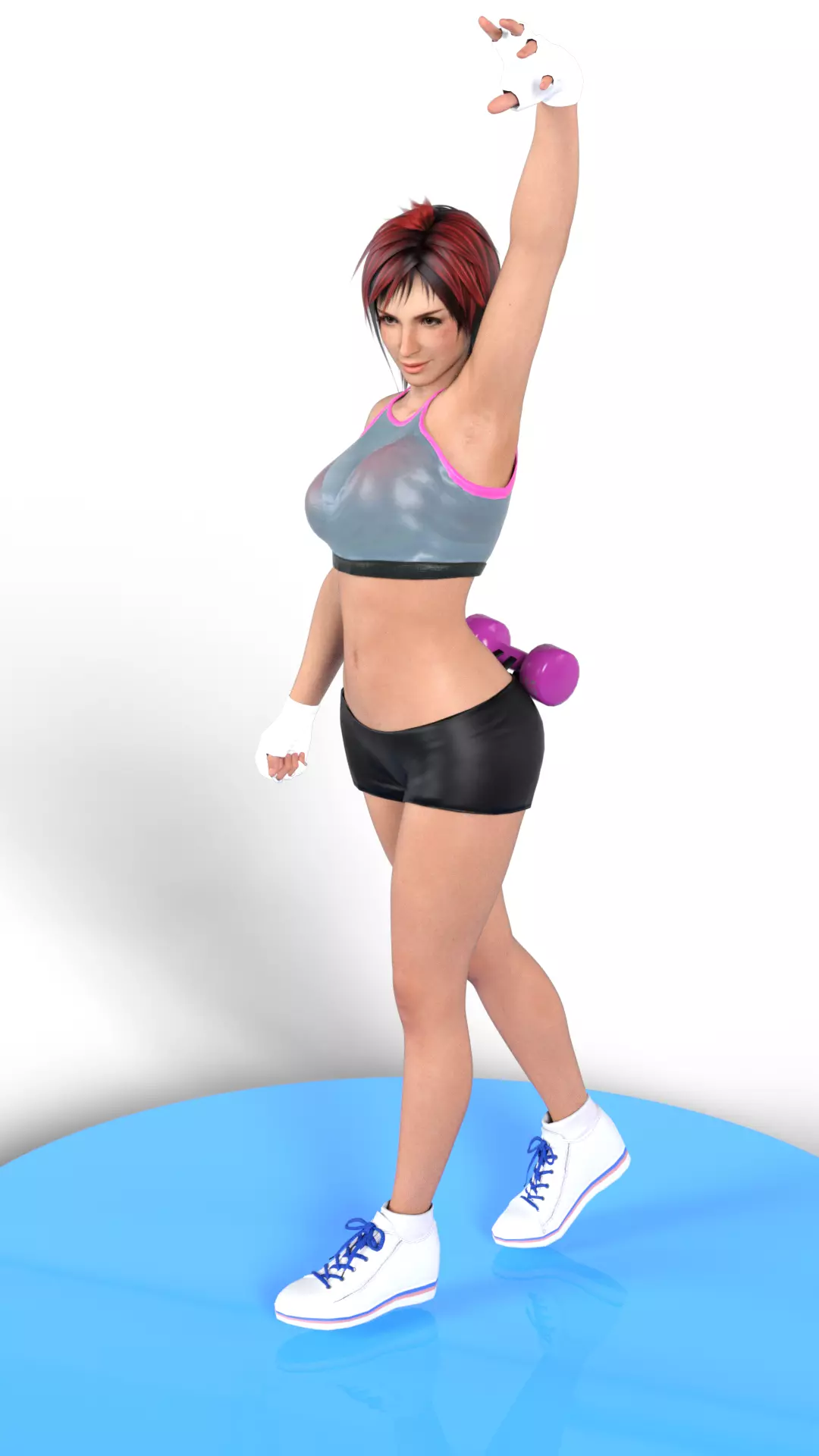 A high-quality 3D render depicting Mila, the Mixed Martial Arts (MMA) fighter from the Dead or Alive video game series, in a dynamic stretching or victory pose. Mila sports her short hair, featuring a distinctive dark red color on top.