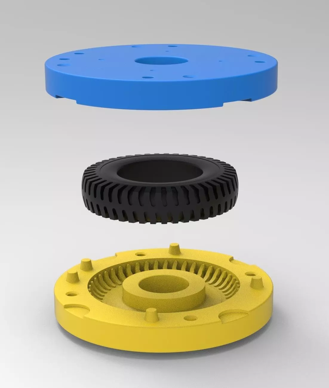 The bottom mold part has 5 special bosses and Top mold part has 5 special holes to guide mold parts in the closed state. Also, there are 4 slots for better opening with a screwdriver or similar instrument.In the Top mold part are 4 small holes for material injection.Both mold parts have 4 holes with diameter 6 mm for bolting it in closed state.Note! Only the mold! This is not a tire!