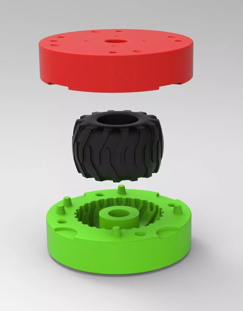 The bottom mold part has 5 special bosses and Top mold part has 5 special holes to guide mold parts in the closed state. Also, there are 4 slots for better opening with a screwdriver or similar instrument.In the Top mold part are 4 small holes for material injection.Both mold parts have 4 holes with diameter 6 mm for bolting it in closed state.Note! Only the mold! This is not a tire!