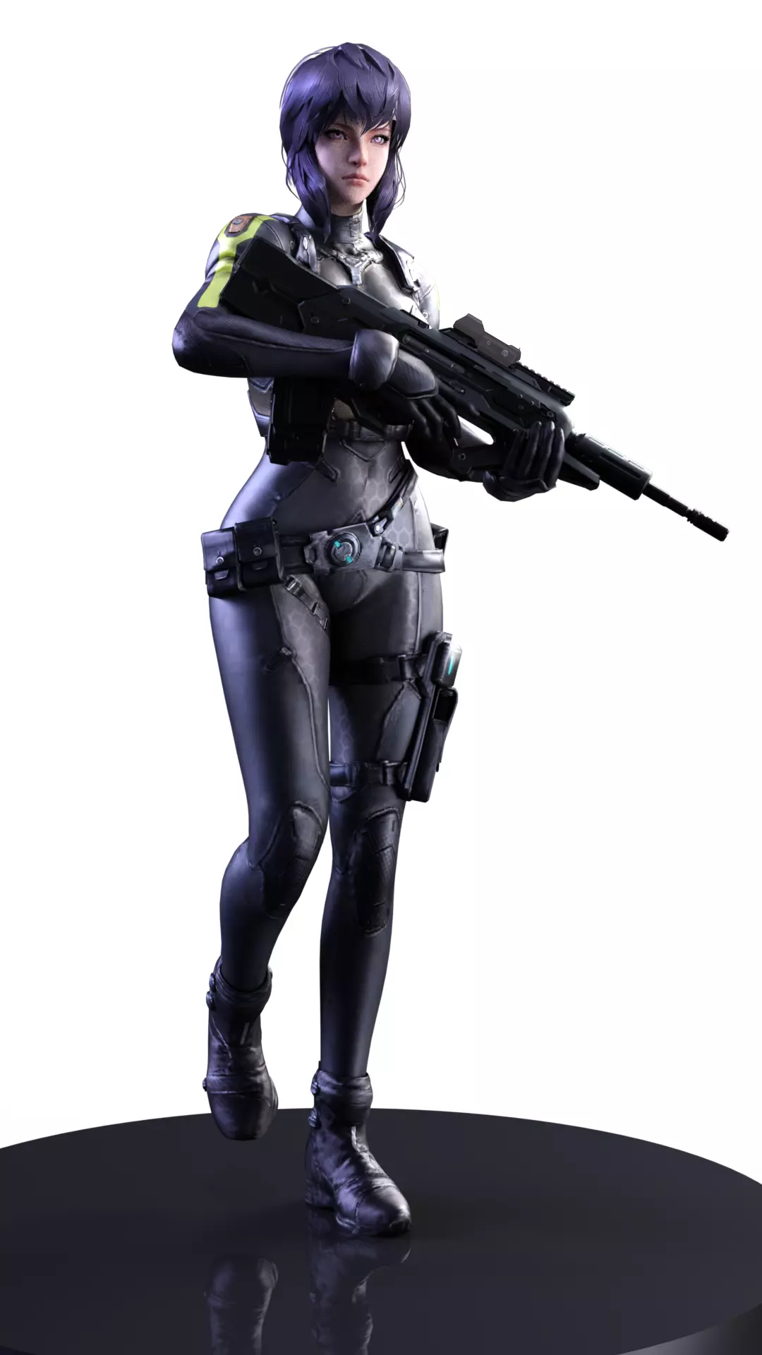 A hyper-realistic 3D render of Major Motoko Kusanagi, the cybernetic protagonist from Ghost in the Shell. The model presents her in a futuristic tactical suit, holding an assault rifle, capturing her determination and cyborg nature. The detail in the suit, weaponry, and her facial expression highlights the render's quality.