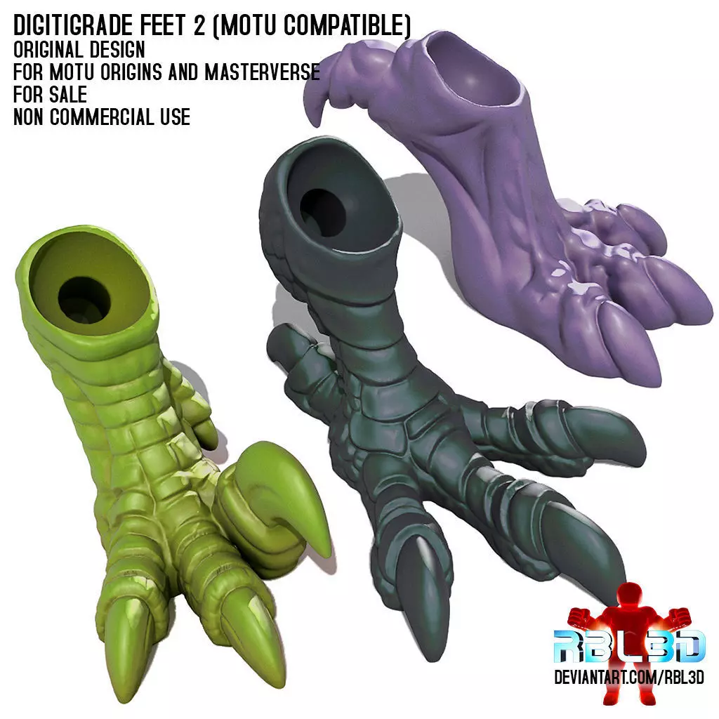 This is the seventh* pack of feet for Motu Origins and Mastersverse and the second one of digitigrade feet.*The sixth has been skipped and reserved for urban footwear.The models included here are a velociraptor foot, very fitting into the motu world; A crow foot, I don't have any avian head atm, but maybe in the future; And a gargoyle foot directly inspired by the Disney's Gargoyles Goliath from Neca.