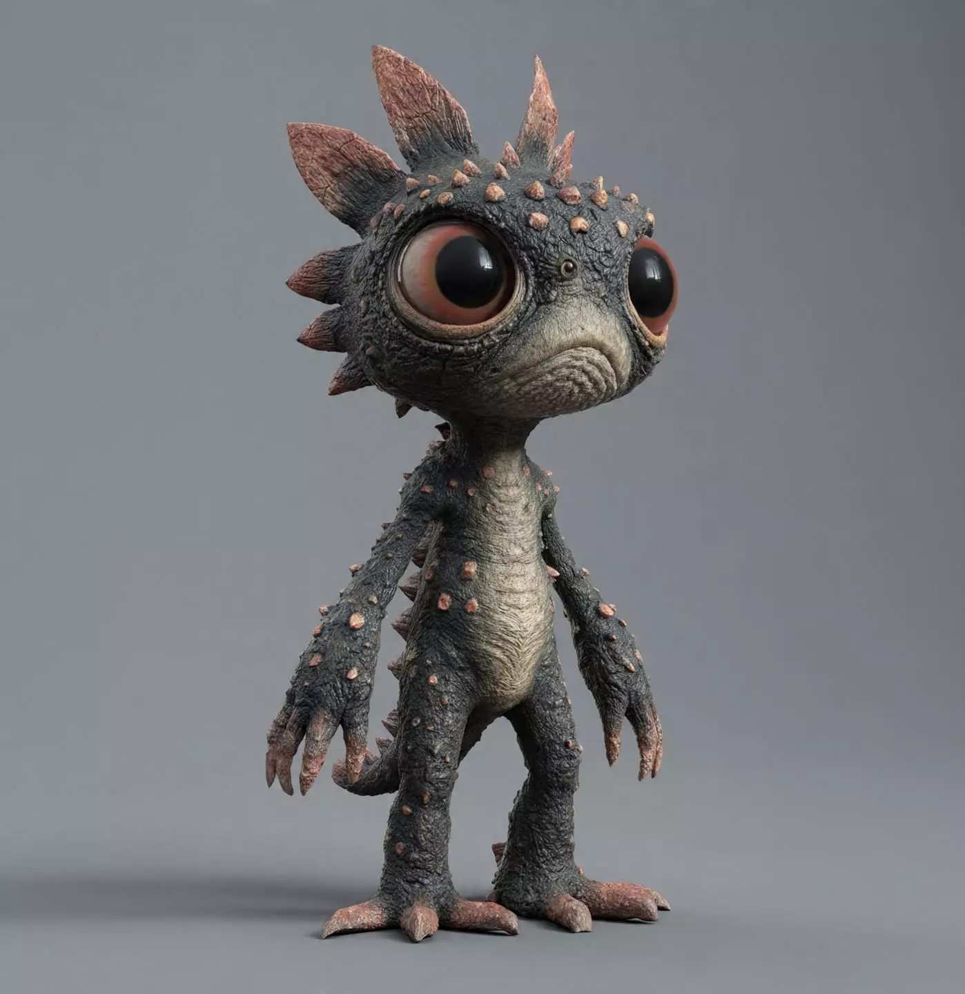 The model captures the essence of a rare juvenile from the planet Xylo, known for its oversized, light-gathering eyes and the hardened, chitinous spikes that cover its body. These dermal armor plates develop a distinctive reddish hue at the tips due to high concentrations of iron oxide in the planet's surface dust, which they absorb during their early molting cycles. The texture features rough, reptilian scales interspersed with softer, almost amphibious skin on the underbelly. This character was sculpted with the intention of bringing a unique, slightly melancholic but ultimately endearing personality to life, making it a perfect collectible for enthusiasts of bizarre and imaginative fauna. This design is optimized for both FDM and resin 3D printing, ensuring every spike and scale is faithfully reproduced.