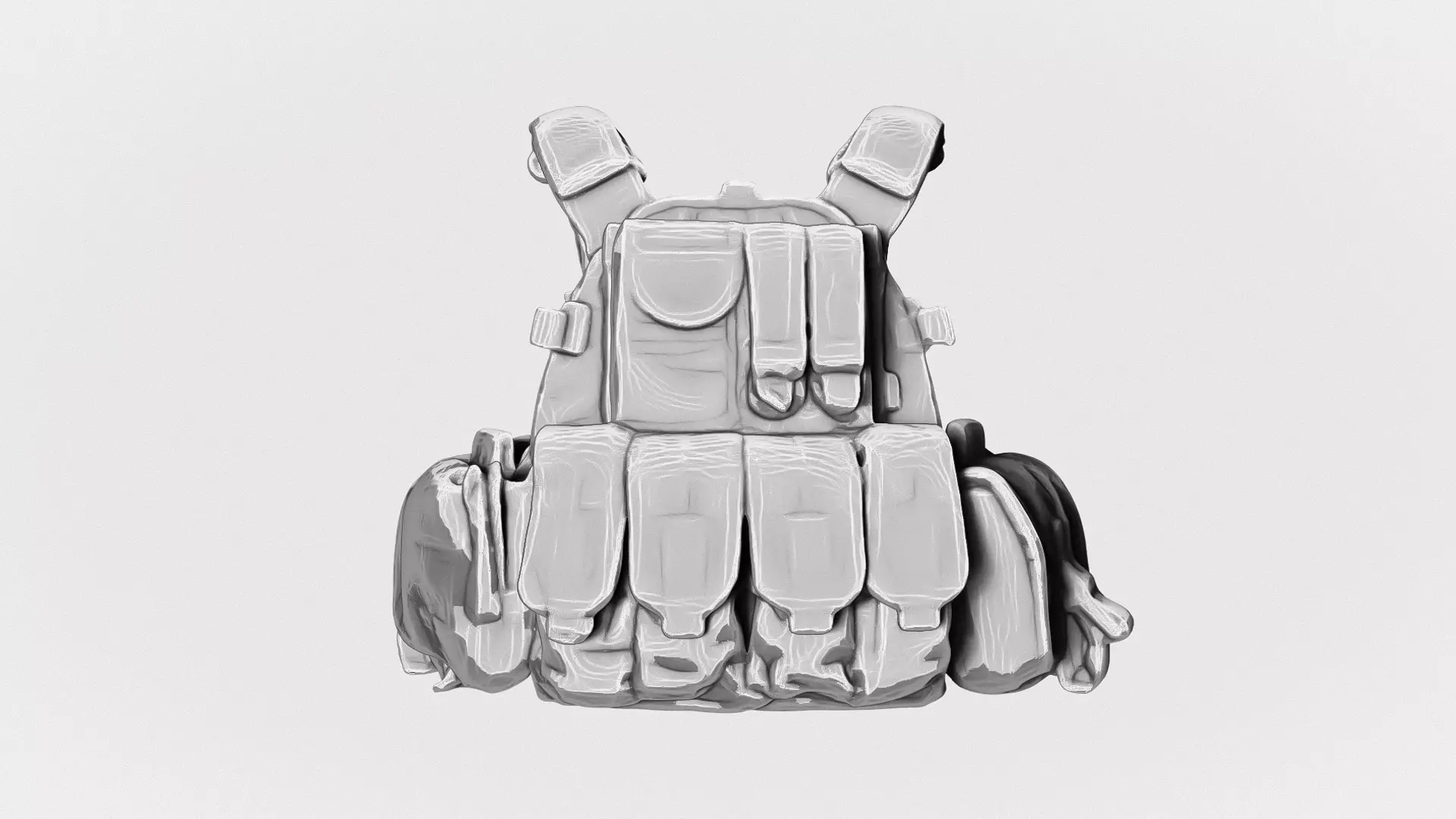 • Detailed pouches, straps, MOLLE webbing, and structural panels