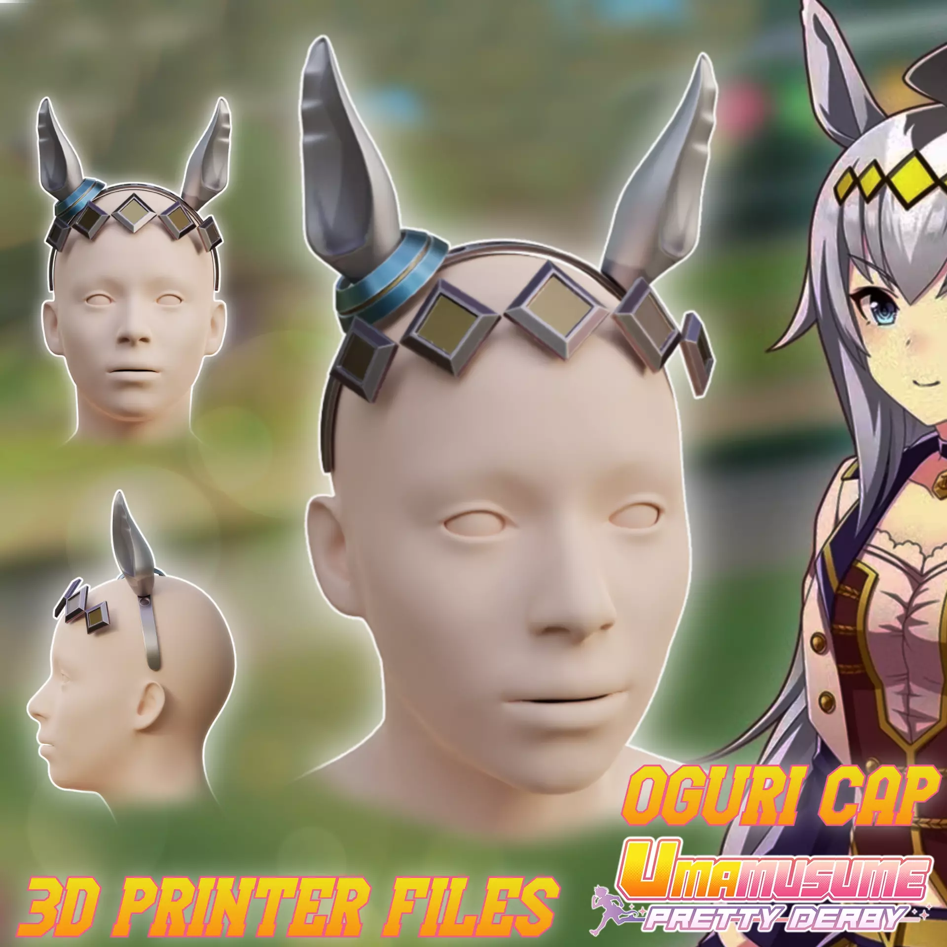 _________________THIS IS A DIGITAL PRODUCT, STL FILES FOR 3D PRINTING___________________________________NON-REFUNDABLE____________________Files to print Oguri Cap Ears and hear Accessories. The supports required. Some parts need to be printed multiple times (file names contain the approximate quantity).Ready for ENDER 3 v2 or similar 220x220x250mm size printer. Many division options for convenient printing included. Designed for 55 cm head circumference. Headband included. 10x2mm optional.