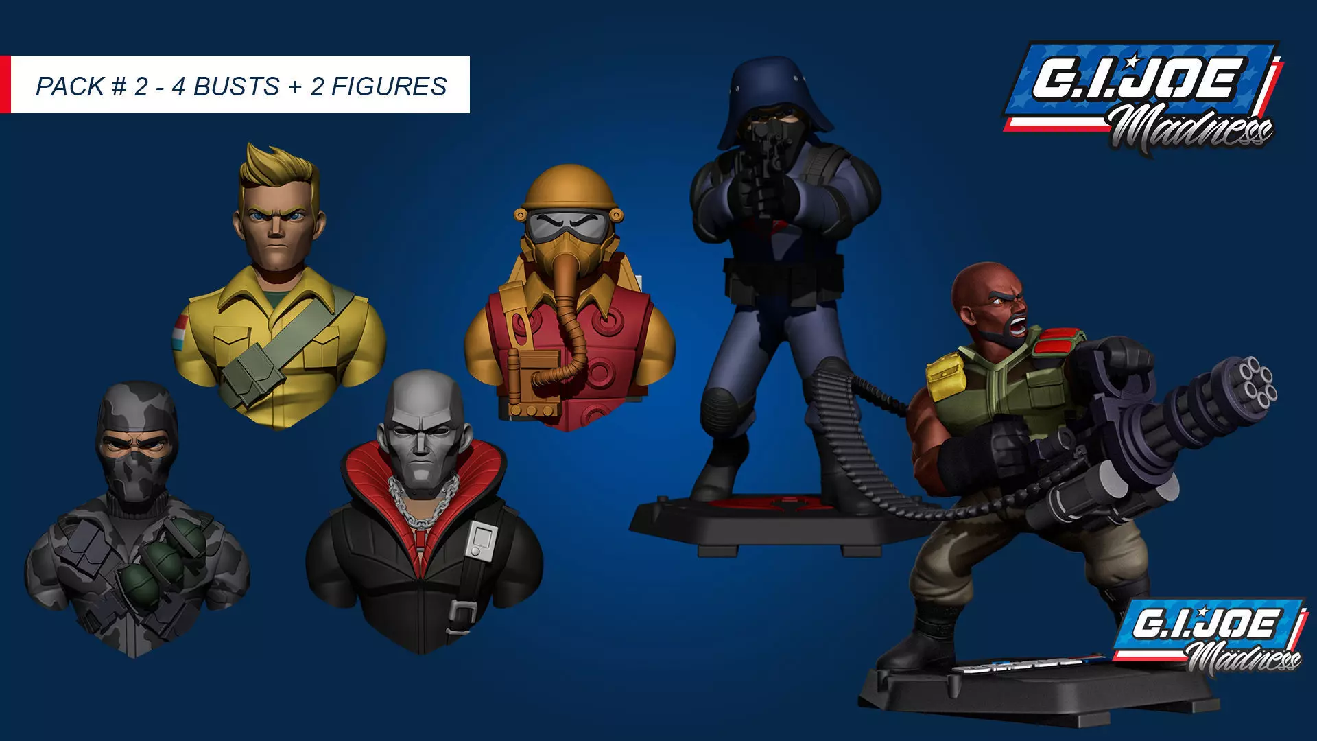We present the second PACK consisting of 6 characters with their respective STL files for 3d printing. This pack is inspired in the characters of the famous 80s series GI JOE A Real American Hero. We have created a series of busts and full-body characters from an approximate height of 4.7 inches. Its size is ideal for print in a standard 3d print machine and has the perfect size to collect them. Each character can be printed in the technology of your choice - PLA or Resin - and then you can paint them with the visual reference that we share with the download files.