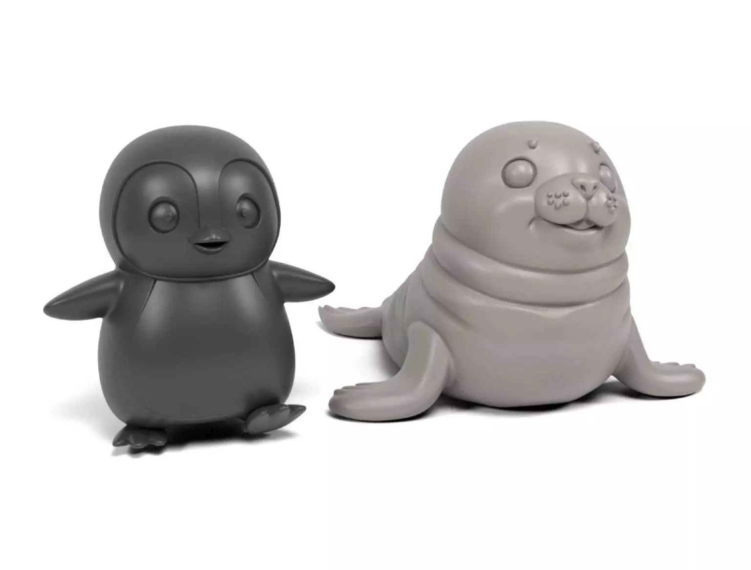 The design embraces a playful and cute theme, depicting a cartoonish penguin and seal. The rounded and smooth features contribute to their adorable appearance.