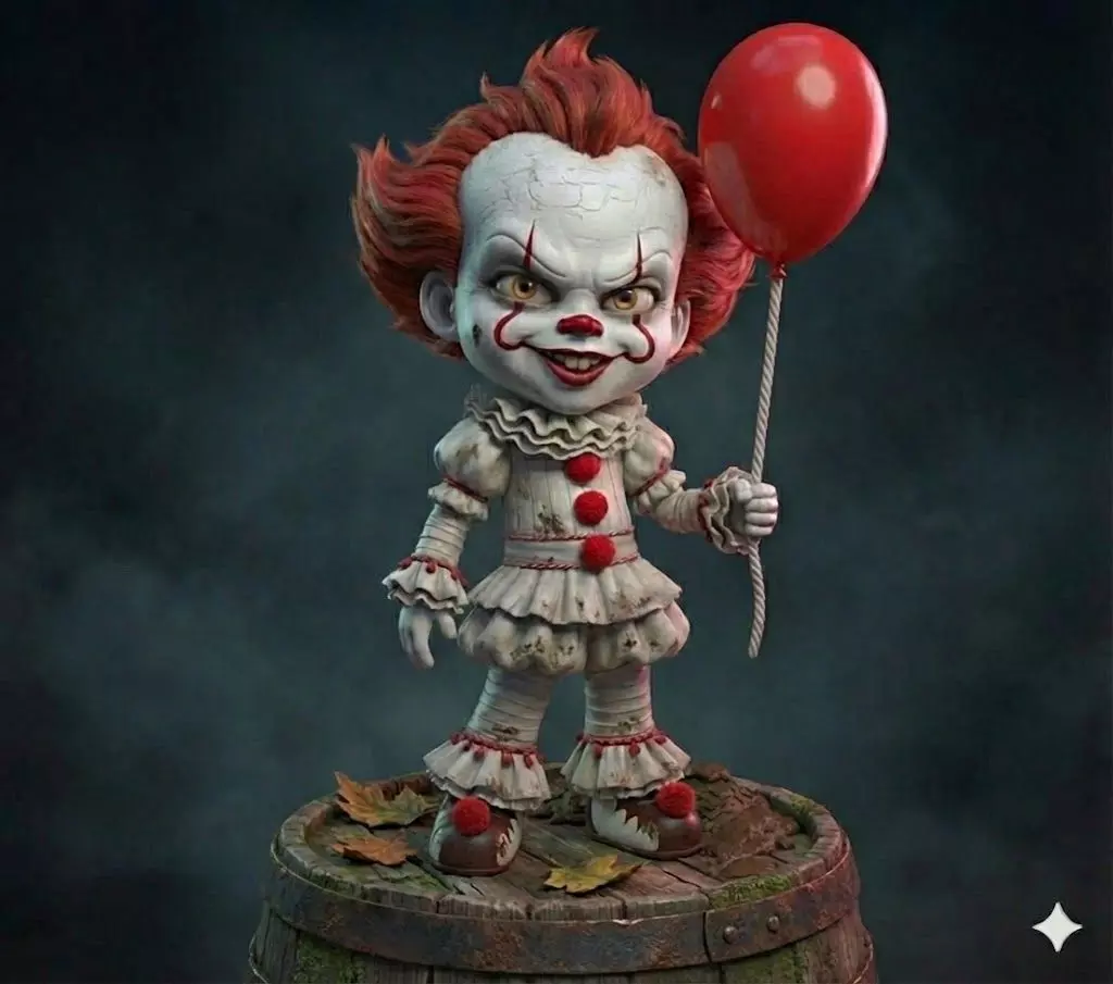 Inspired by the iconic clown from It, this design combines classic details of the character—his frilly suit, the red balloon, and his unsettling gaze—but reinterpreted in an adorable and collectible style.