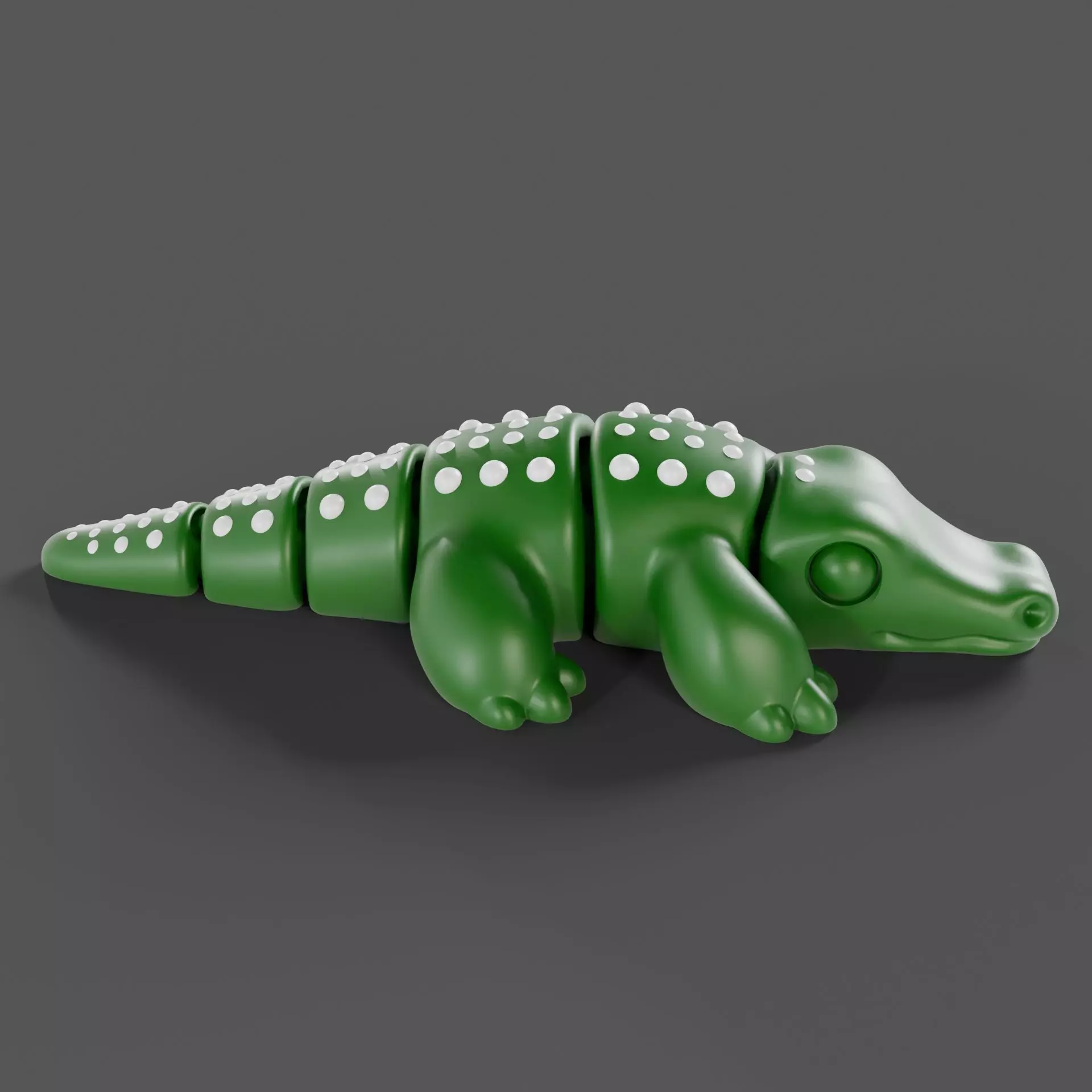 This cheerful 3D model features a segmented cartoon-style alligator toy with smooth, rounded geometry and decorative white polka dots along its back. Designed with a child-friendly aesthetic, the model is perfect for educational games, animations, toy prototyping, or decorative scenes.The segmented body suggests flexibility, making it suitable for rigging or articulation in digital environments. It is also ready for 3D printing (STL format included) and works wonderfully for digital texture painting, giving artists freedom to customize colors, materials, and surface details.