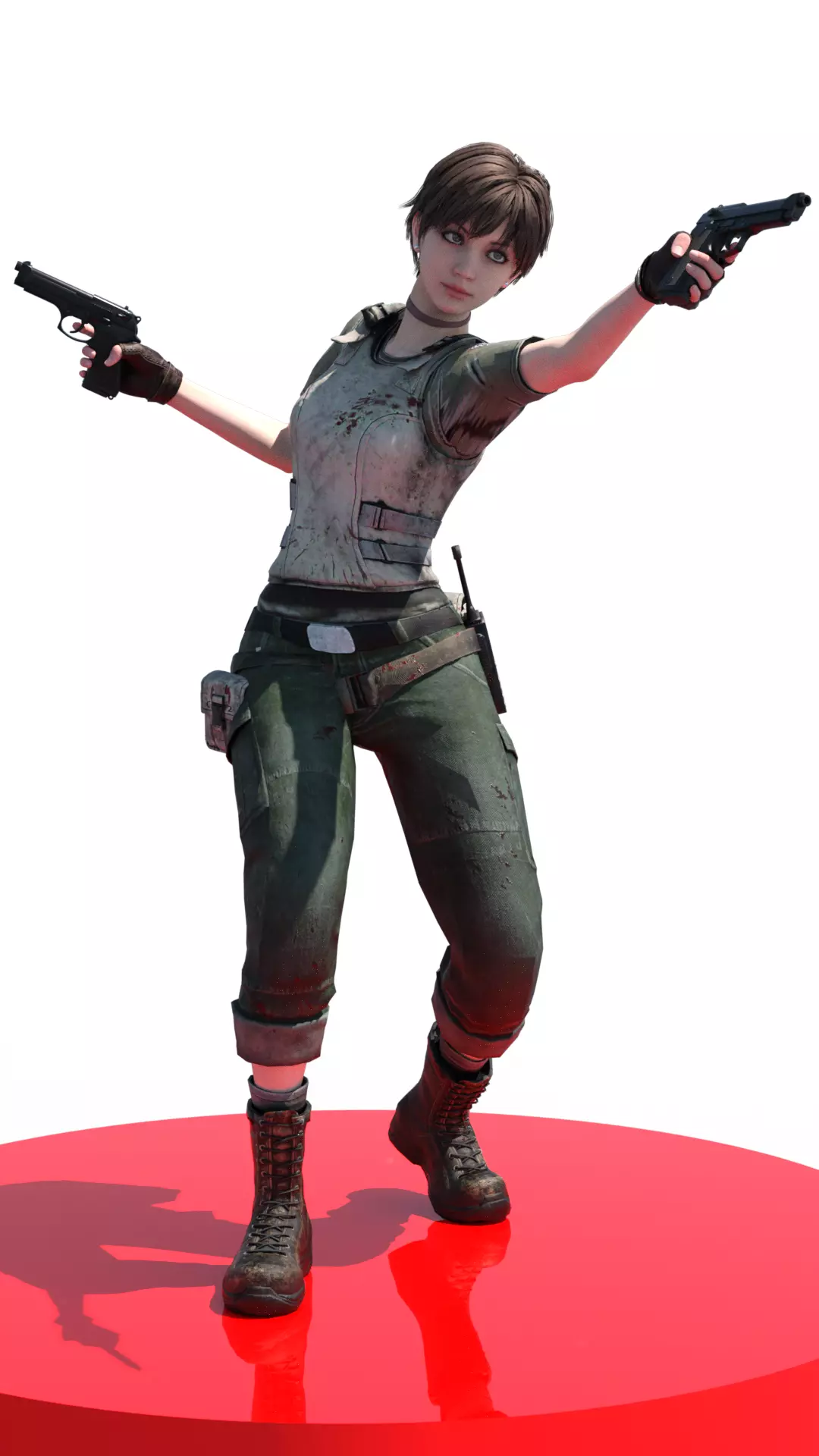 A high-quality 3D render of Rebecca Chambers, the young medic and Bravo Team member of S.T.A.R.S. from the acclaimed Resident Evil saga. The figure is shown in a dynamic action pose, dual-wielding two pistols, ready to face biological threats. Her tactical attire consists of a dirty combat shirt/vest, olive green cargo pants, and laced military boots, all detailed with textures of dirt and bloodstains, reflecting the intensity of survival in Raccoon City. The model captures her characteristic short hair and focused expression. The scene is presented on a reflective circular red platform, highlighting the figure against the black background.