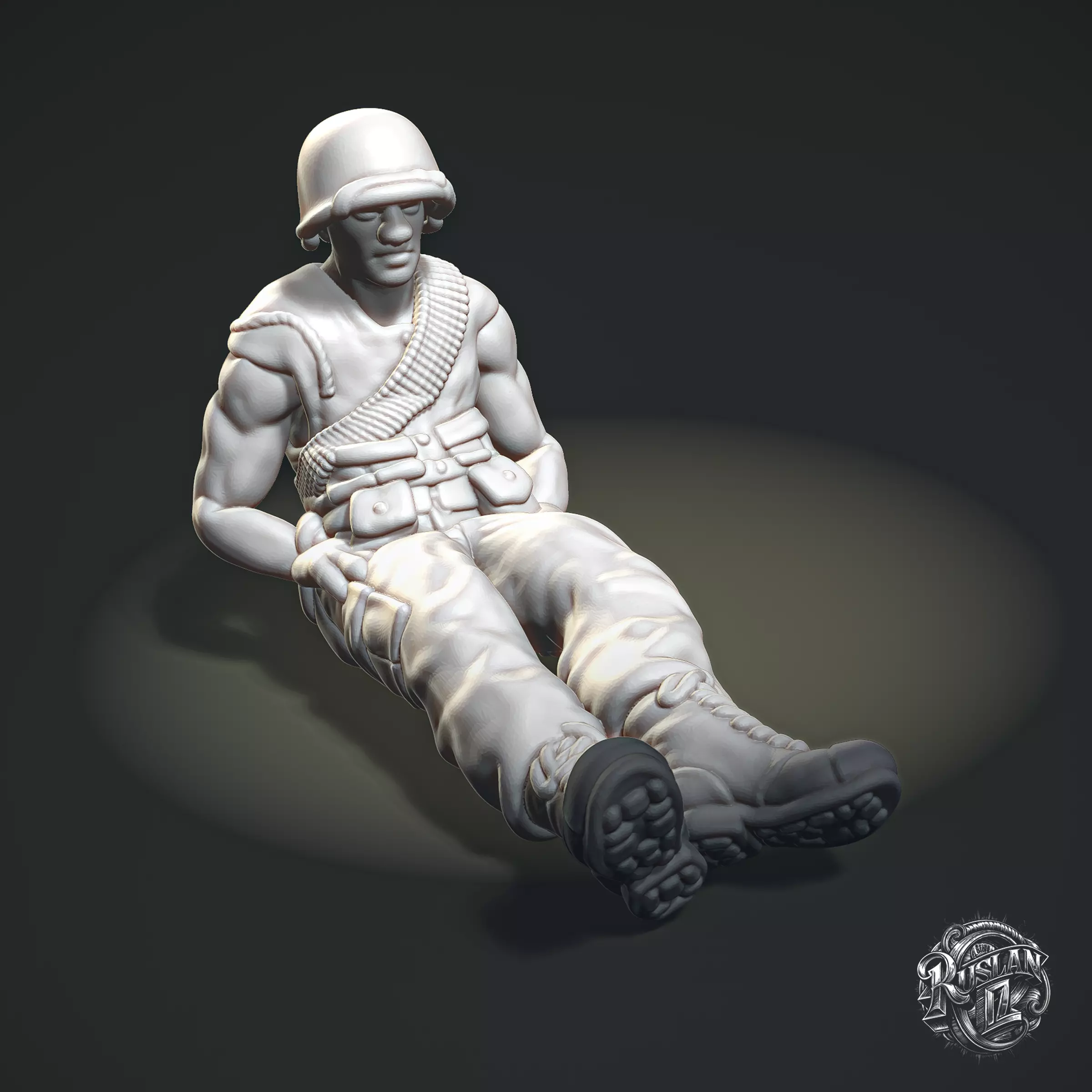 Introducing the high-quality 3D model Relaxed Soldier. This soldier, sitting on the ground in a relaxed pose, is perfect for enhancing your collection of miniatures or adding a unique element to your military dioramas and games.