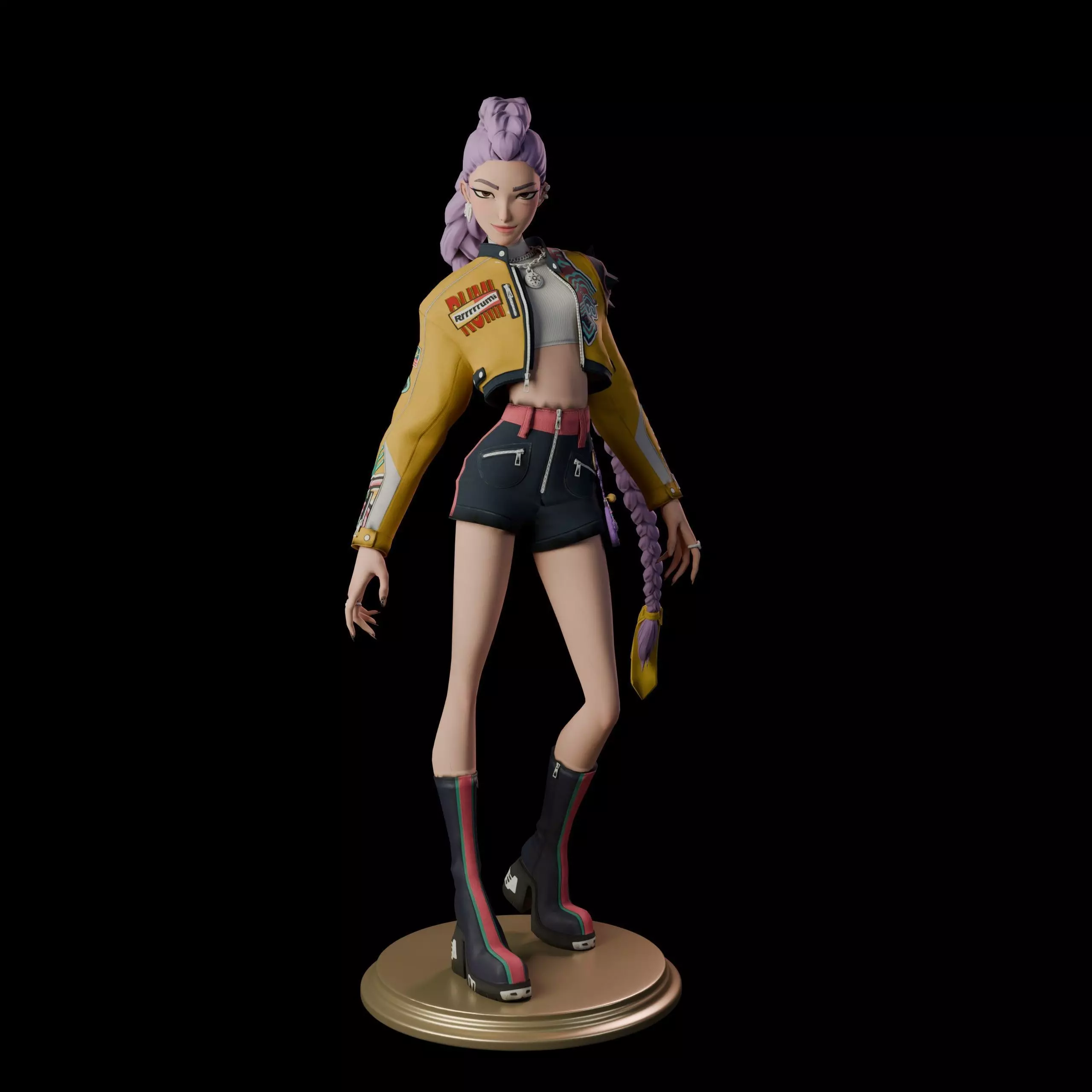 3D model descriptionDiscover this meticulously crafted 3D printable model of Rumi Kang, the charismatic leader and main vocalist of the K-pop girl group HUNTR/X from the hit 2025 animated musical fantasy KPop Demon Hunters by Sony Pictures Animation. As a half-demon cambion born to the legendary demon hunter and K-pop idol Ryu Mi-yeong and a demon father, Rumi grapples with her hidden heritage while sealing the Golden Honmoon to banish demons forever. Wielding a powerful saingeom sword infused with spirit magic, she balances her stage persona with her secret role as a protector, all while hiding her markings and fearing rejection. This fan-made model captures her in an empowering pose with sword raised, sleek performance outfit, long flowing hair, and determined expression, perfect for collectors, cosplayers, and KPop Demon Hunters fans.
