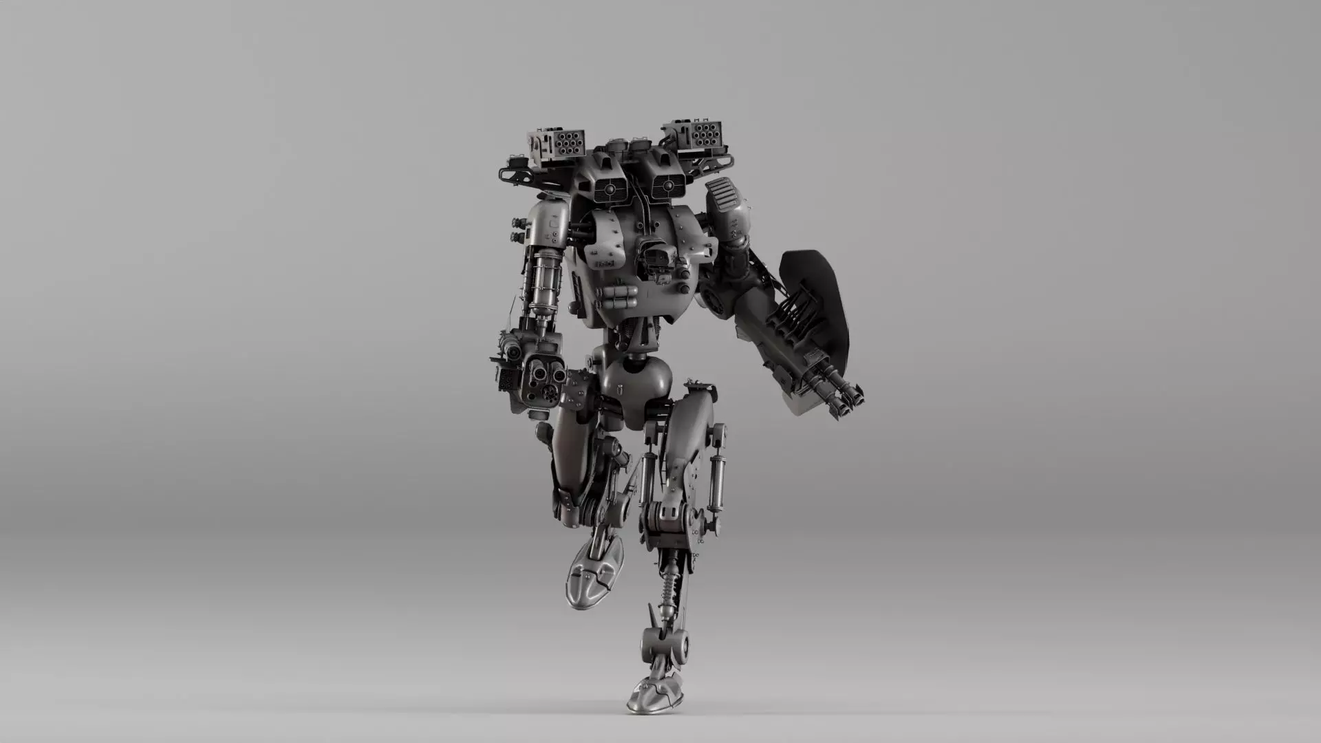 Highly detailed advanced military combat mech designed for realistic sci-fi warfare environments. This model features a heavy industrial design with exposed mechanical components, reinforced armor plating, hydraulic leg systems, missile launchers, and integrated heavy weapon modules.