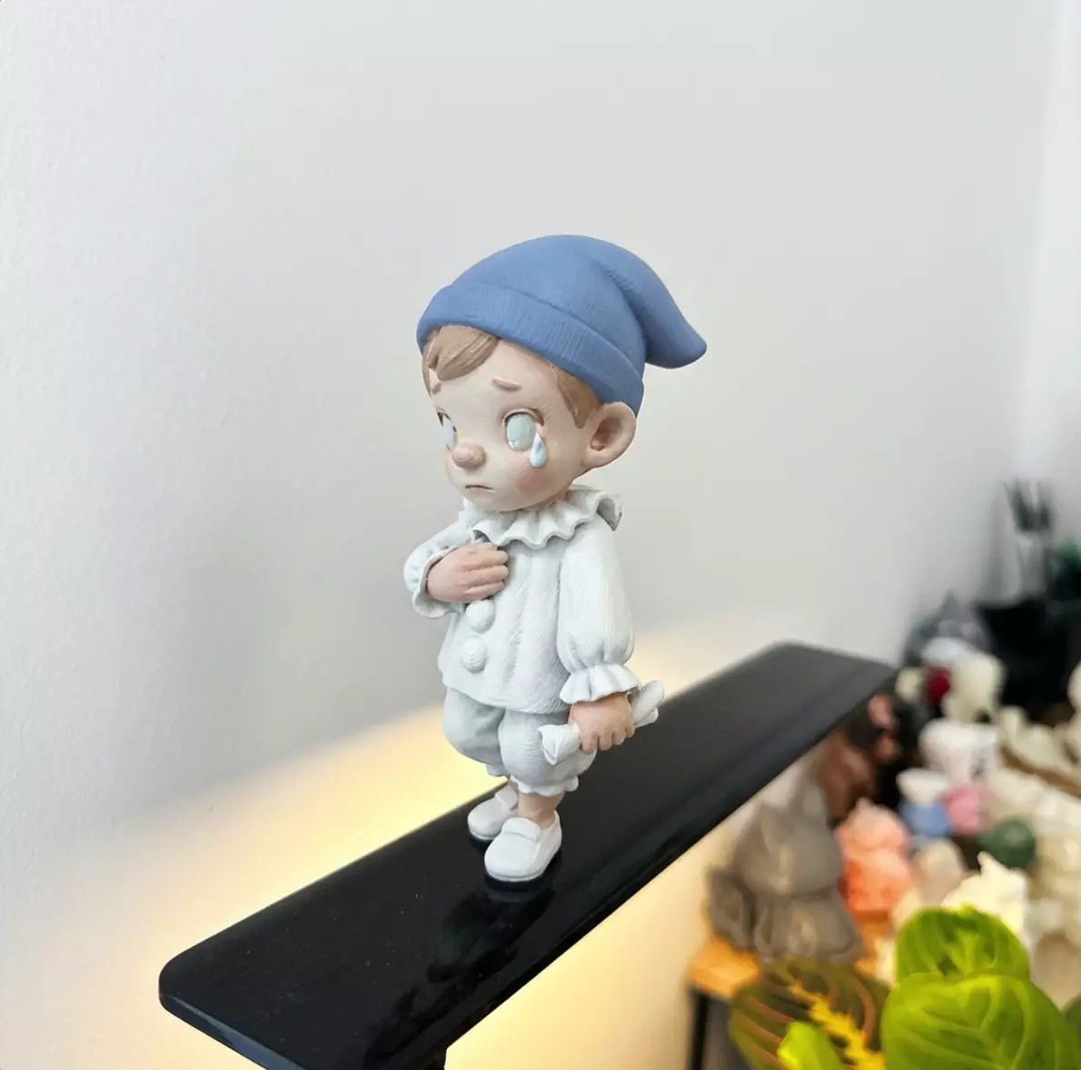 A stylized detailed figurine of Pierrot from the fairy tale about the wooden boy Buratino. Pierrot is a shy, melancholic clown, and this version shows him with a single tear on his cheek and a small letter in his hand. The design focuses on a gentle, emotional character that works both as a classic Pierrot and as a recognizable Buratino companion.