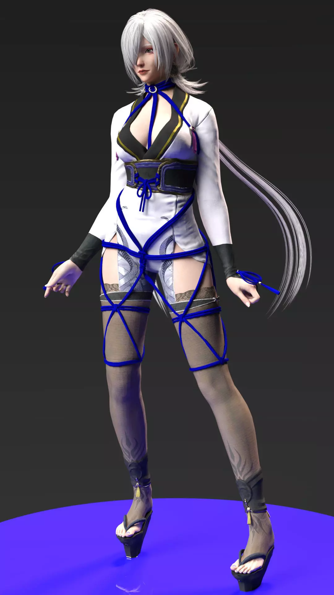 This 3D render showcases Seori with her signature silver-white hair and a mysterious gaze. Her outfit is a sophisticated blend of a white tactical kimono and an intricate blue rope system (shibari-inspired) that wraps around her body. She wears translucent thigh-high stockings with dark tattoo patterns and modernized high-platform geta sandals.
