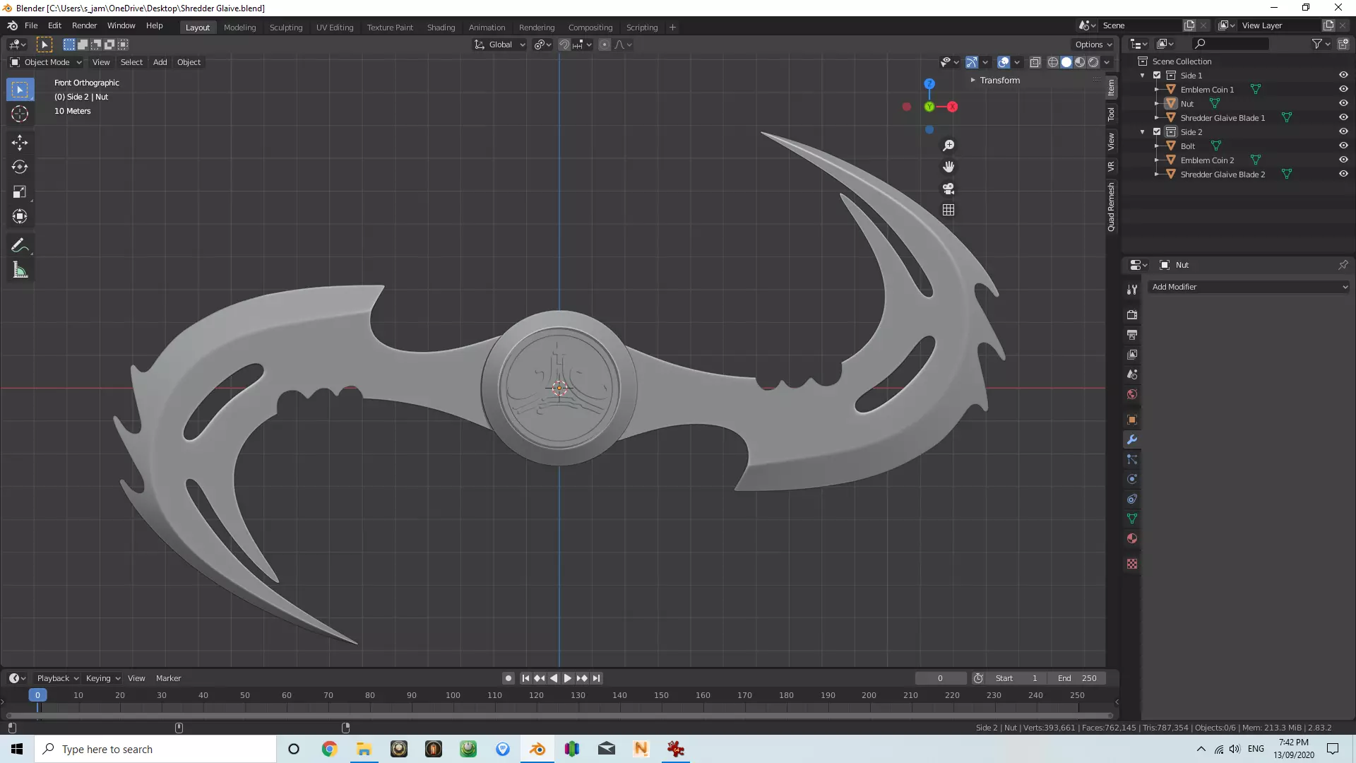 I would recommend printing with a resin printer for strength as to be accurate to the movie the blades are approximately 5.5mm thick.It can be printed with an FDM printer but it would be a good idea to coat them in some form of resin for added rigity.The nut and bolt in the model are there for reference if people want to use a real nut and bolt for durability but you can print them if you choose to as it would still work fine as a display piece