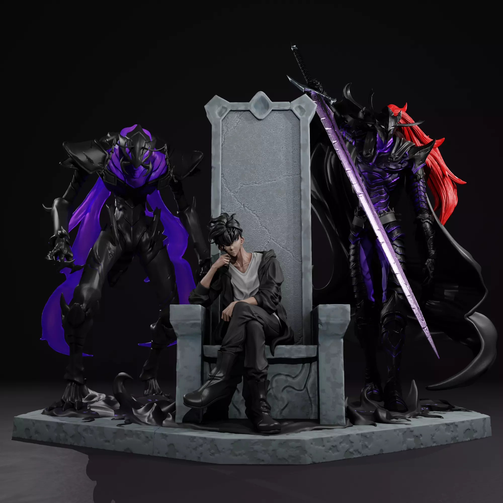 Dive into the mesmerizing world of Solo Leveling with this meticulously crafted 3D printable model featuring Sung Jinwoo, the protagonist, along with his formidable shadow soldiers, Beru and Igris.