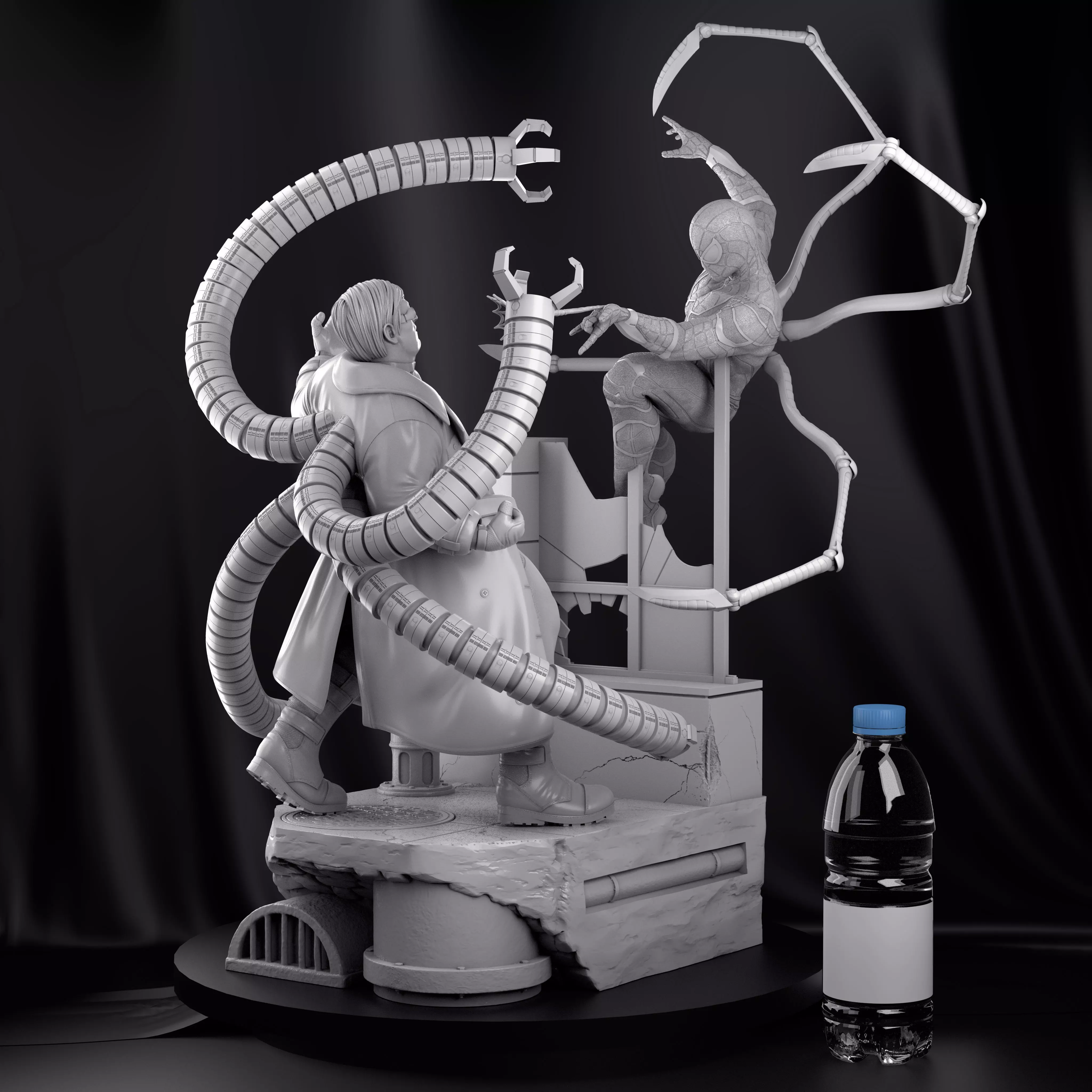 Spider man in iron suit vs Dr Octopus diorama for 3D print.Can be print in any type of printing, splited and keyed for easy printThe original scale is 1/4(45~50cm), but can be resized for less withou lost quality.